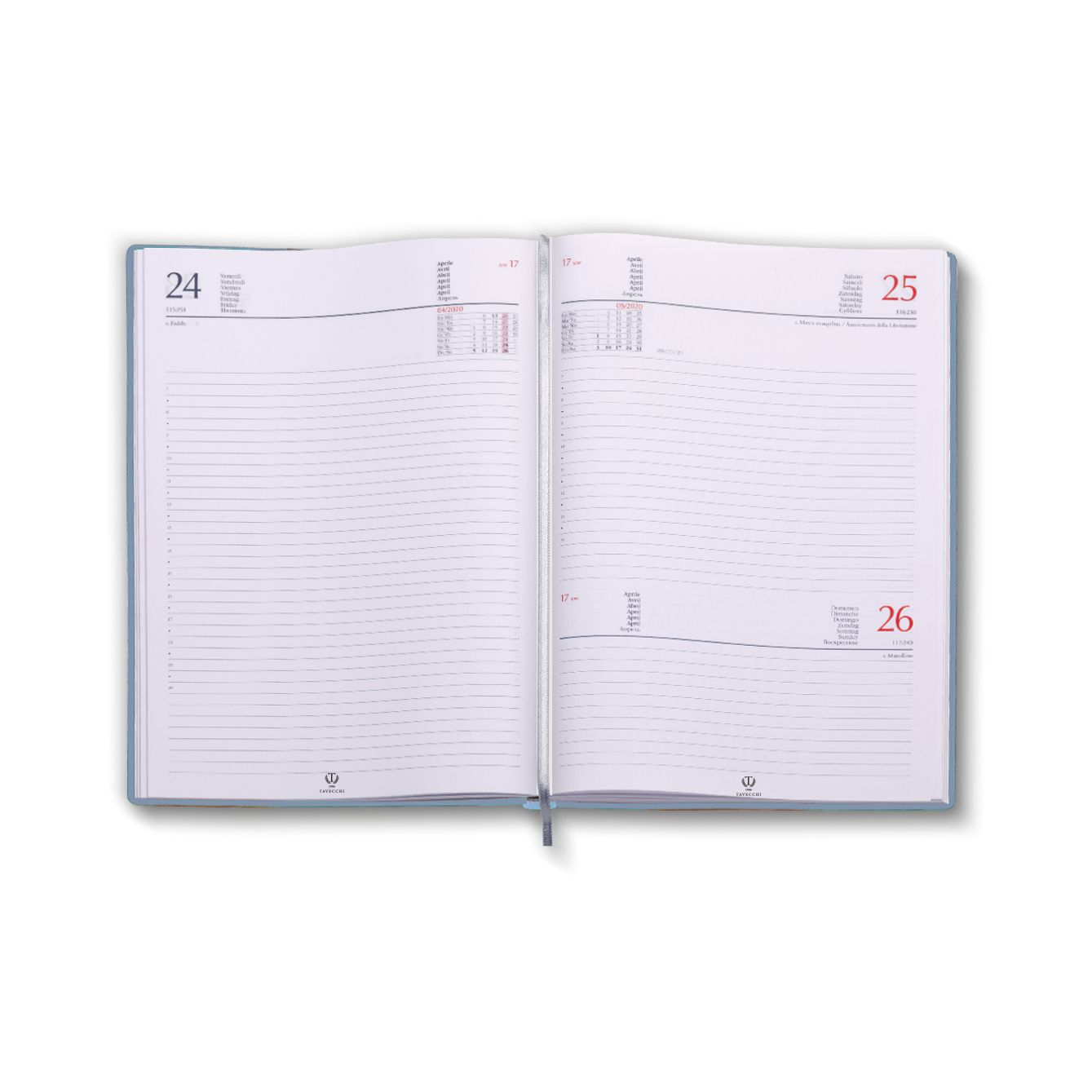 Agenda giornaliera “Tavecchi”. 320 pag. Materiale: printflex termovirante. Interno stampa 2 colori. Multi-lingue. Carta bianca. Sabato e domenica abbinati, rubrica telefonica, festività del mondo. Colori: arancio, blu, rosso, verde, verde acido. Dimensioni cm.15×21 Imballo: 20xcolore