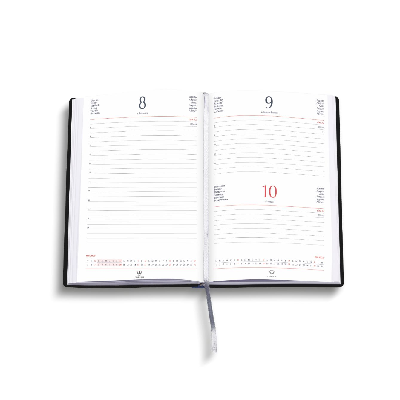 Agenda giornaliera “Tavecchi”.320 pag. Materiale : printflex termovirante. Interno stampa 2 colori. Multilingue. Carta bianca usomano. Rubrica telefonica. Colori: blu, arancio, verde acido, nero rosso, verde. Dimensioni cm. 11×17