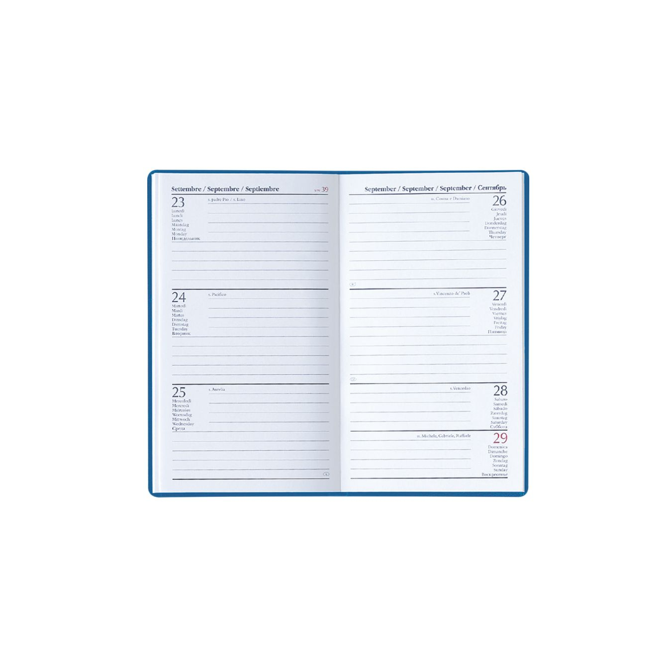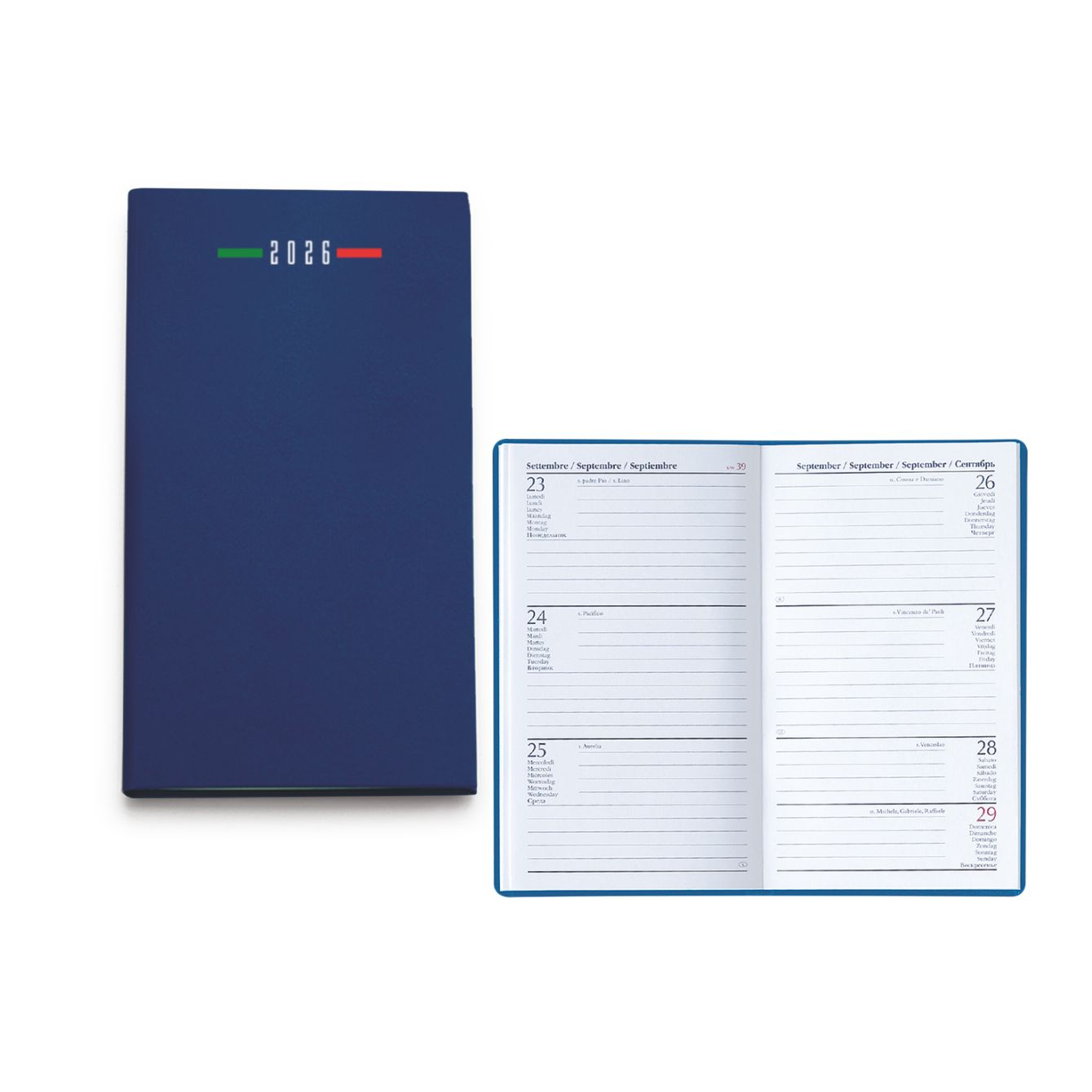 Agendina settimanale in matra. 128 pag. Interno stampa 2 colori. Multilingue, rubrica telefonica, cartina geografica. Colore unico. Dimensioni cm 8×14 Imballo: 100