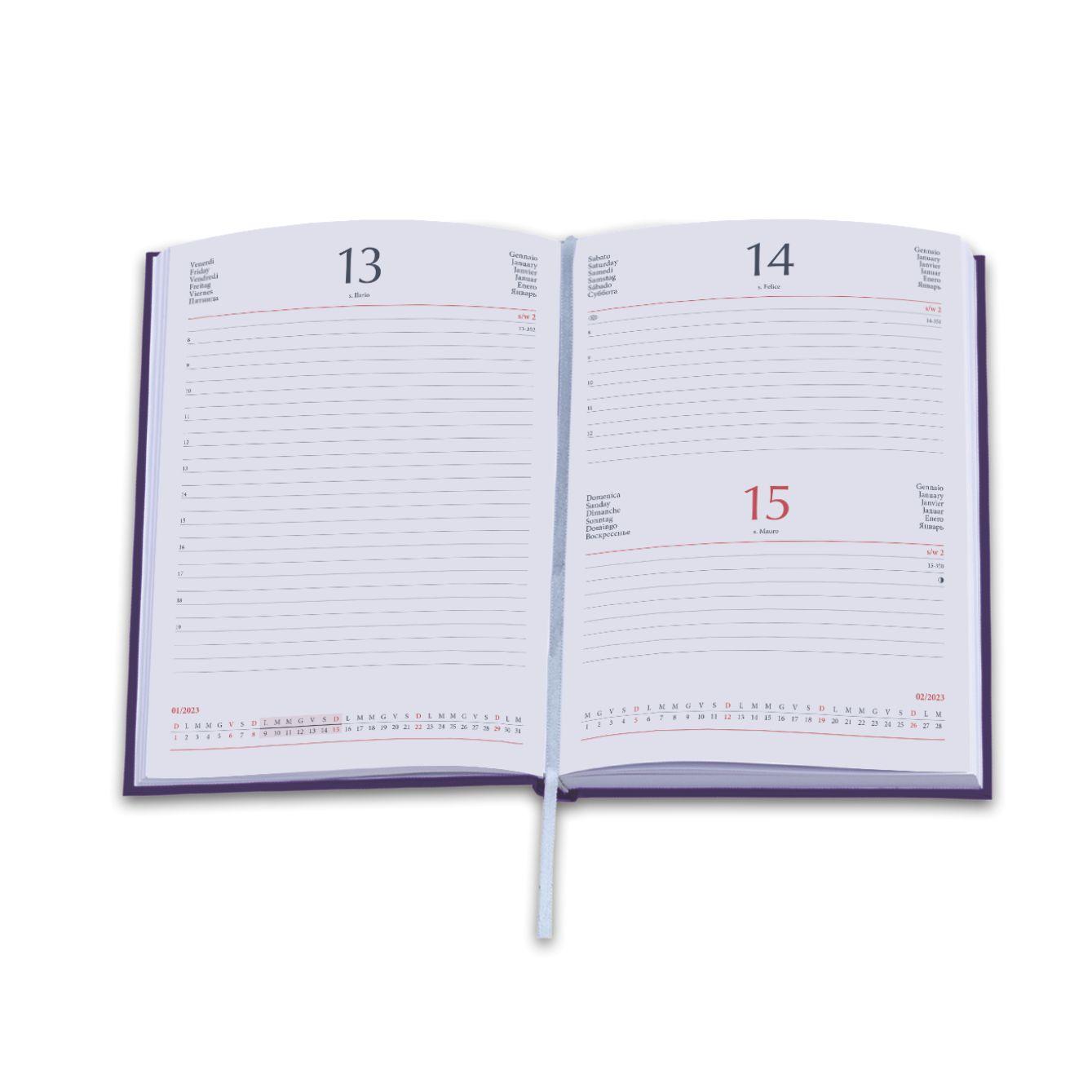Agenda giornaliera in matra. 320 pag. Interno stampa 2 colori. Multilingue. Sabato e domenica abbinati, rubrica telefonica, cartina geografica, festività nel mondo. Colori: verde, blu, bordeaux, nero, rosso, grigio, camouflage. Dimensioni cm 15×21 Imballo: 20xcolore