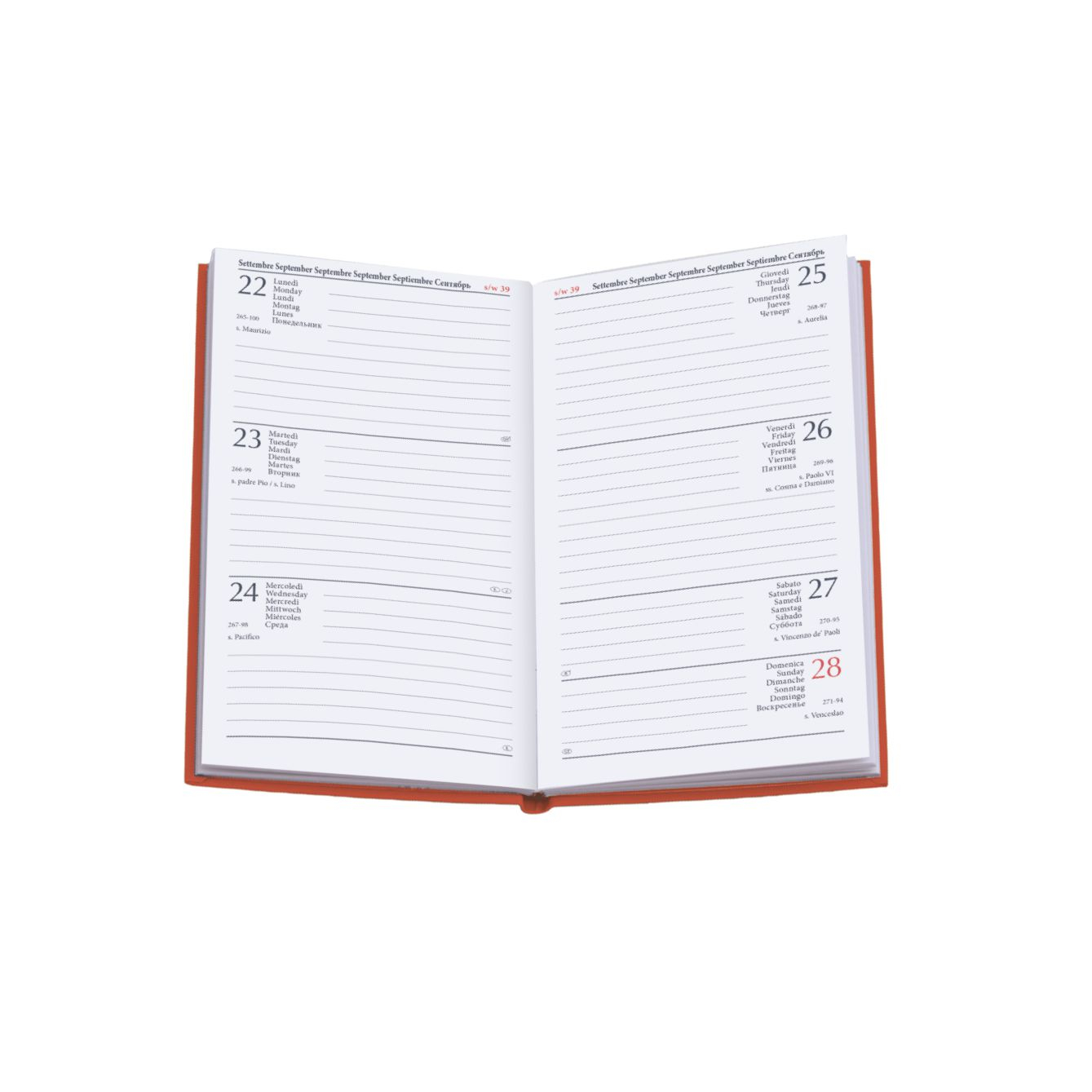 Agendina settimanale in matra. Interno stampa 2 colori. Multilingue, rubrica telefonica. Colori pastello: arancio, bianco, cielo, verde, verde acqua, royal. . Dimensioni cm 8×14. Pagine 128.