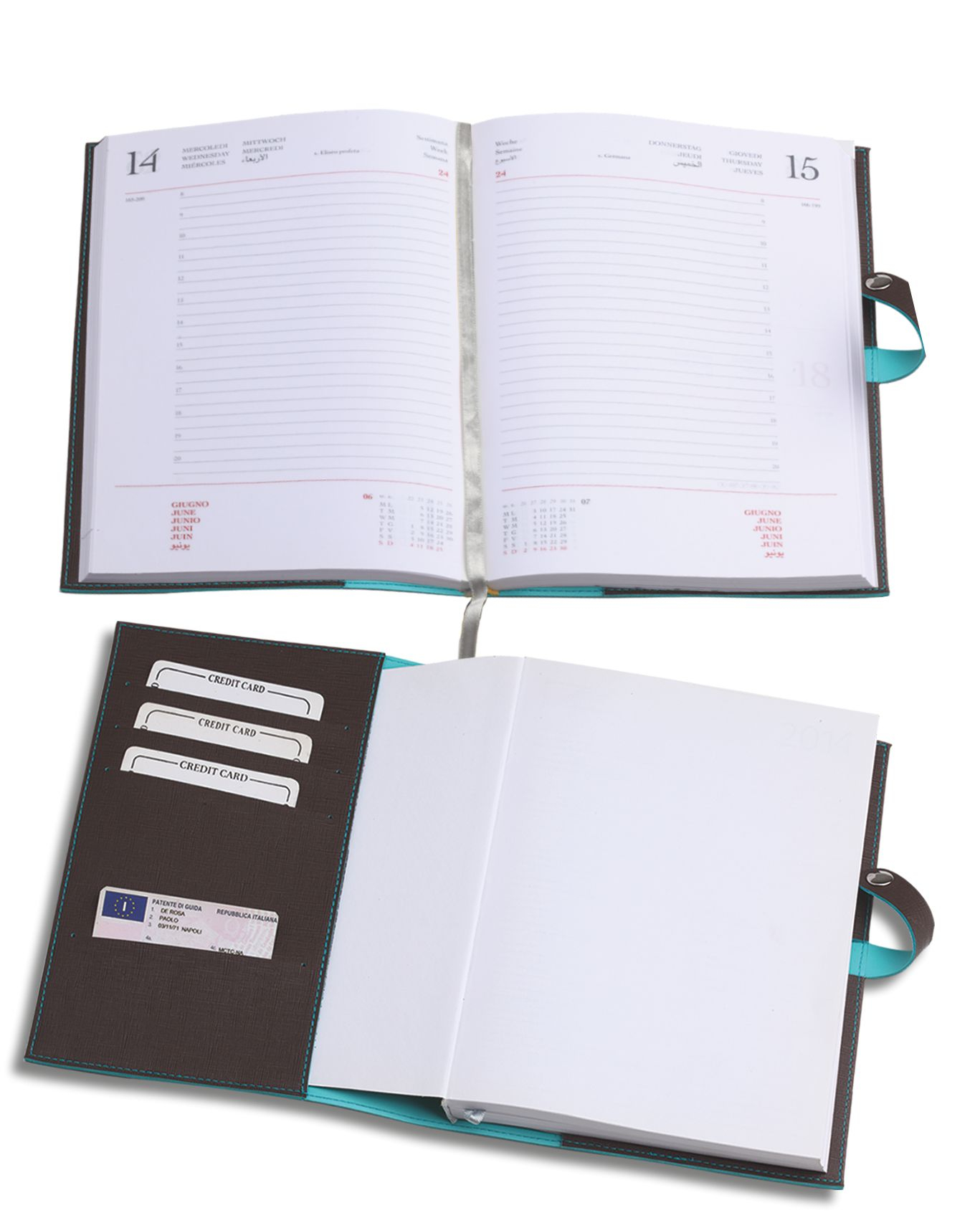 Agenda similpelle. 320 pag. Varie tasche p/card. Interno mobile giornaliero (15×21). Stampa 2 colori. Multilingue. Rubrica telefonica. Carta bianca. Colori: blu, nero, bordeaux, tortora. Confezione in astuccio Dimensioni cm.16×22