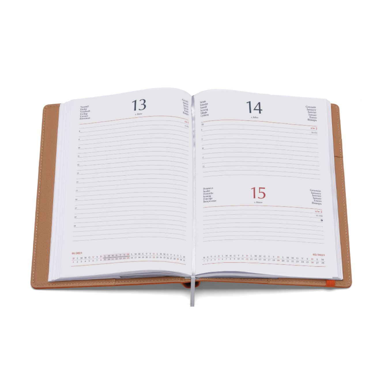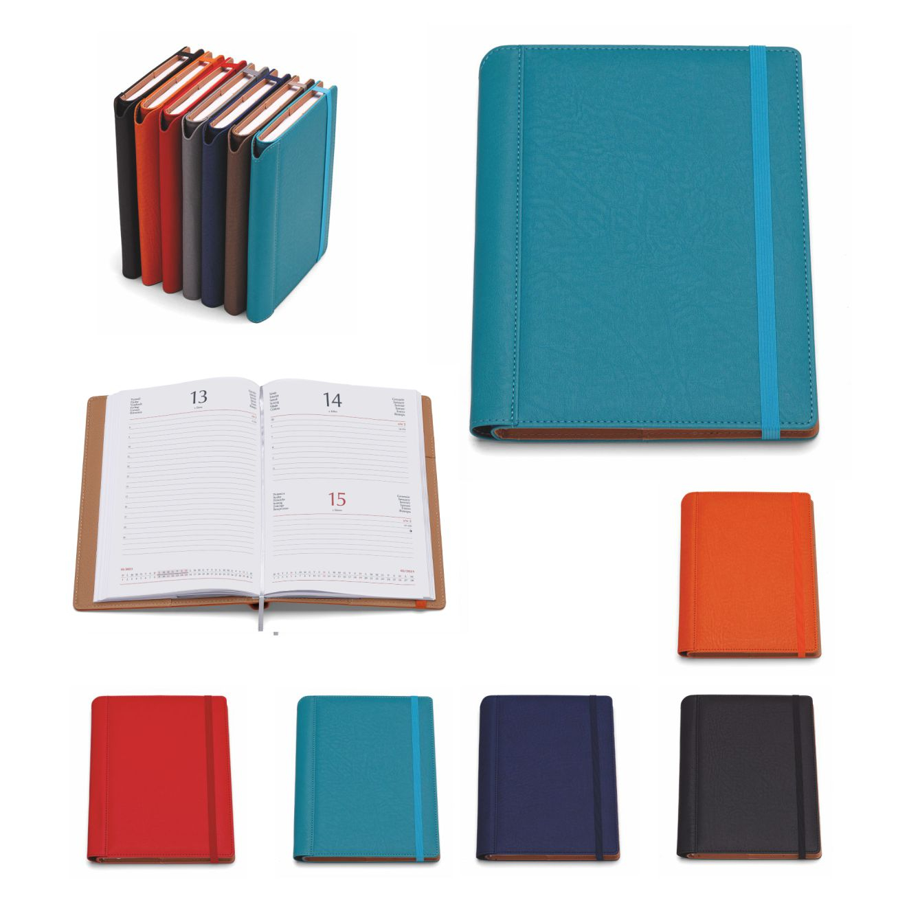 Agenda Pu termovirante. 320 pag. Chiusa da elastico. Interno mobile giornaliero (15×21). Stampa 2 colori. Multilingue. Sabato e domenica abbinati, rubrica telefonica. Carta bianca 60gr usomano. Colori: arancio, marrone, grigio, turchese, rosso, blu, nero. Confezione in astuccio. . Dimensioni cm. 17×22 Imballo: 30xcolore