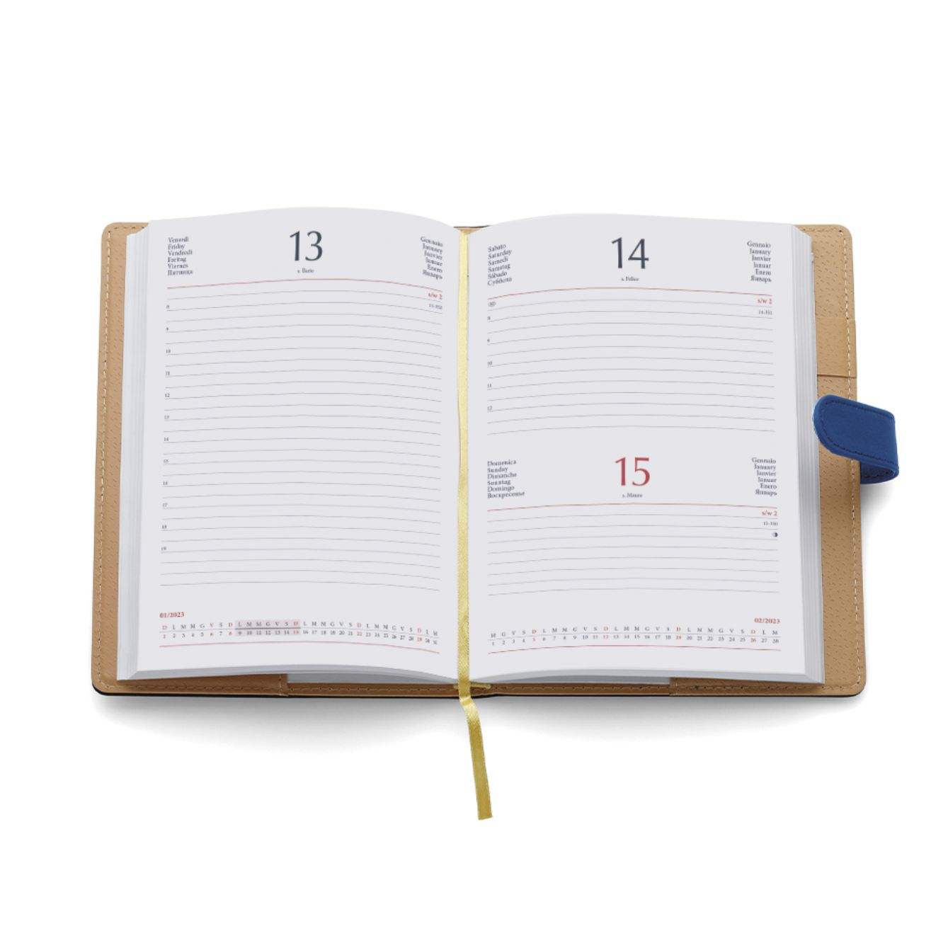 Agenda Giornaliera con inserto per penna e tasca esterna Interno estraibile. Termovirante. Dimensioni: cm 15×21, sabato e domenica abbinati, 320 pag. carta usomano bianca 60gr. Confezione in Astuccio. Imballo: 30pz.