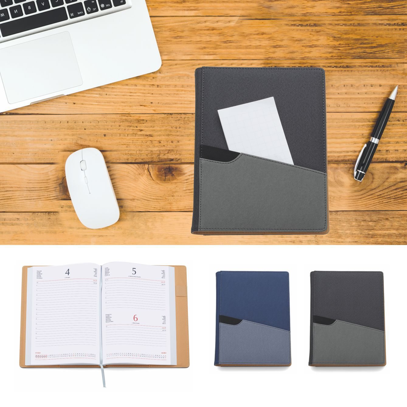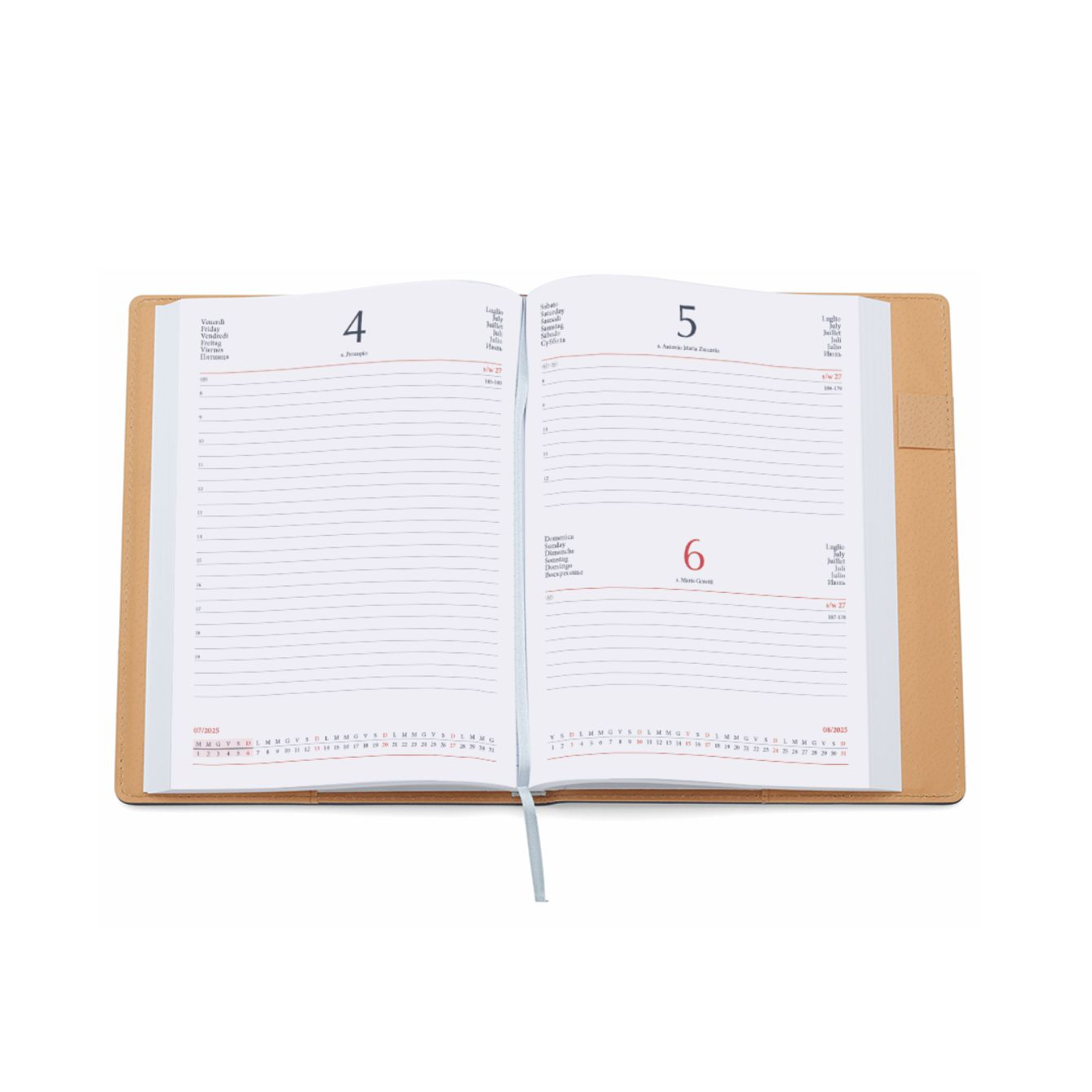 Agenda Giornaliera con inserto per penna e tasca esterna Interno estraibile. Termovirante. Dimensioni: cm 17×24, sabato e domenica abbinati, 320 pag. carta usomano bianca 60gr. Confezione in Astuccio. Imballo: 30pz.