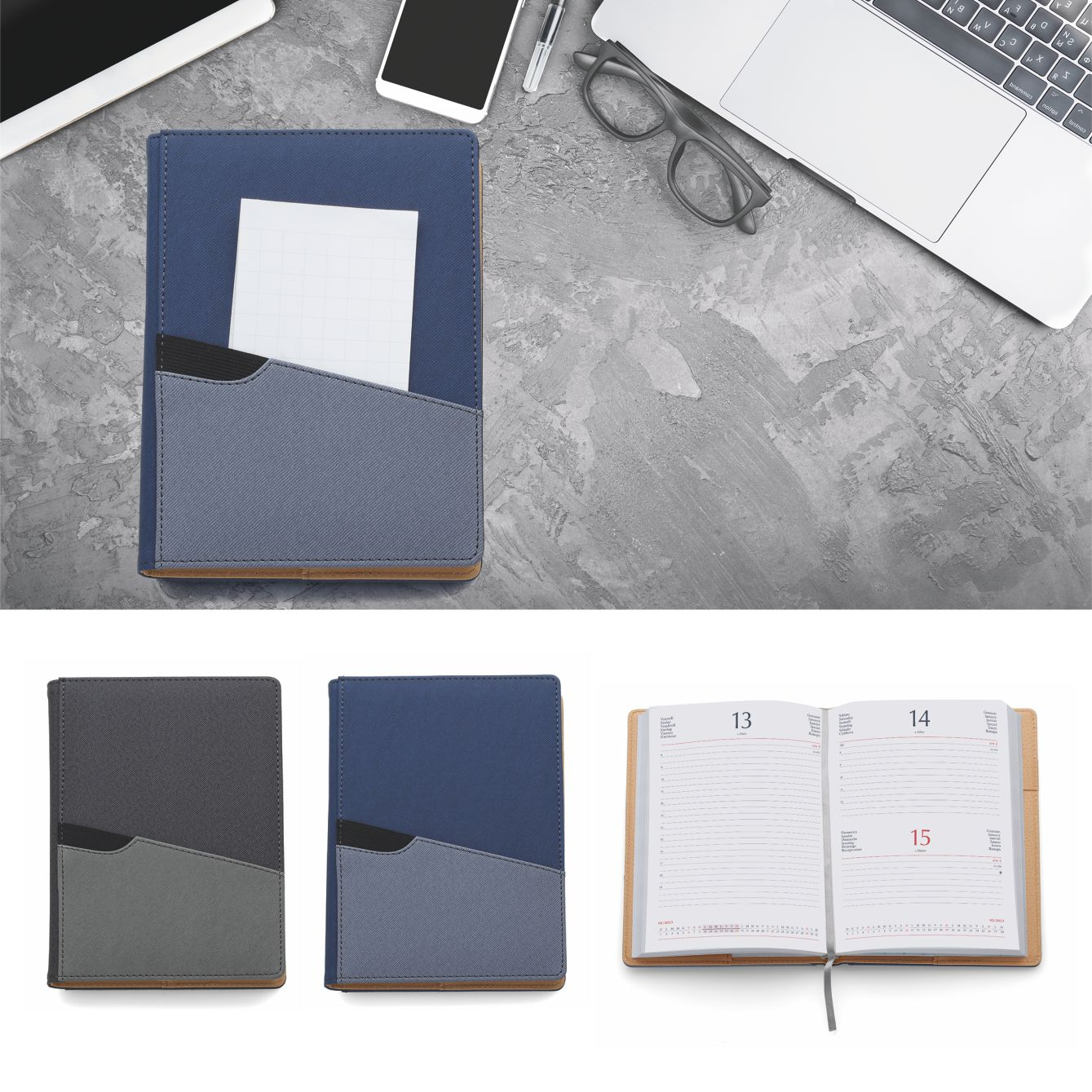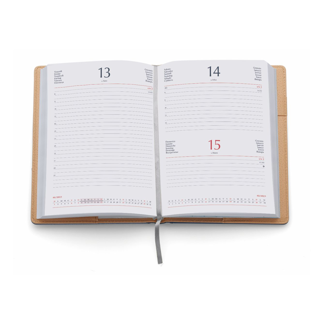 Agenda Giornaliera con inserto per penna e tasca esterna Interno estraibile. Termovirante. Dimensioni: cm 15×21, sabato e domenica abbinati, 320 pag. carta usomano bianca 60gr. Confezione in Astuccio. Imballo: 30pz.