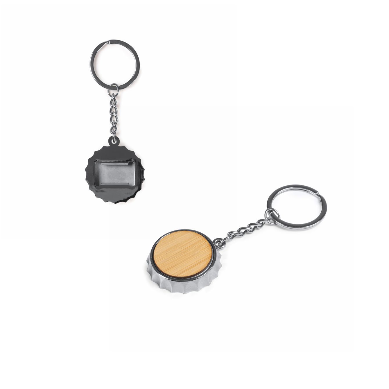 Portachiavi apribottiglie con design a piastra metallica. Finitura cromata e superficie in bamboo. Dimensioni: cm 11×4Ø. Semplice, raffinata, immancabile nella tua quotidianità.
