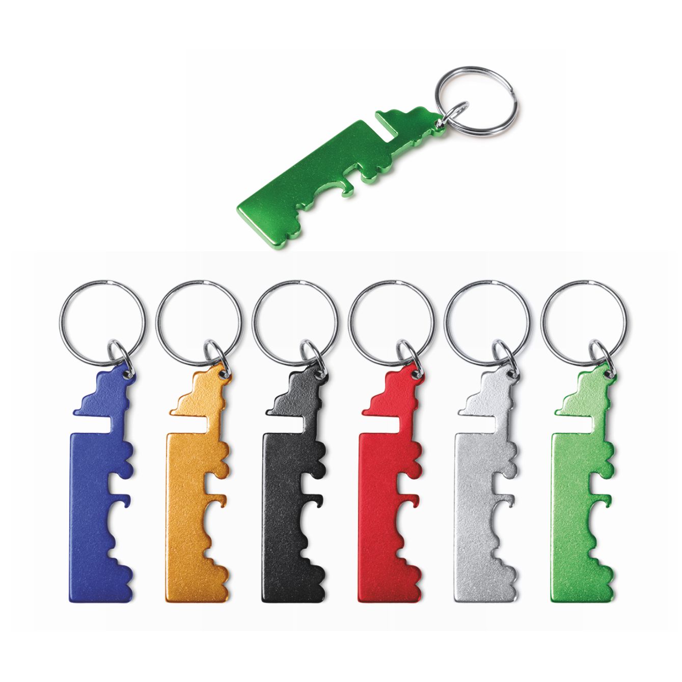 Portachiavi apribottiglie a forma di passerella in alluminio riciclato. Dimensioni: cm 2×9,5×0,3. Ideale per un utilizzo quotidiano, con un occhio attento al design.