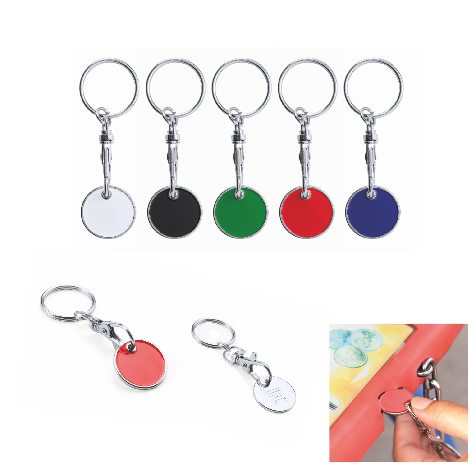 Portachiavi con gettone per il carrello della spesa. In alluminio. Dimensioni: cm 6×2,3. Confezione in astuccio. Imballo: 1000pz