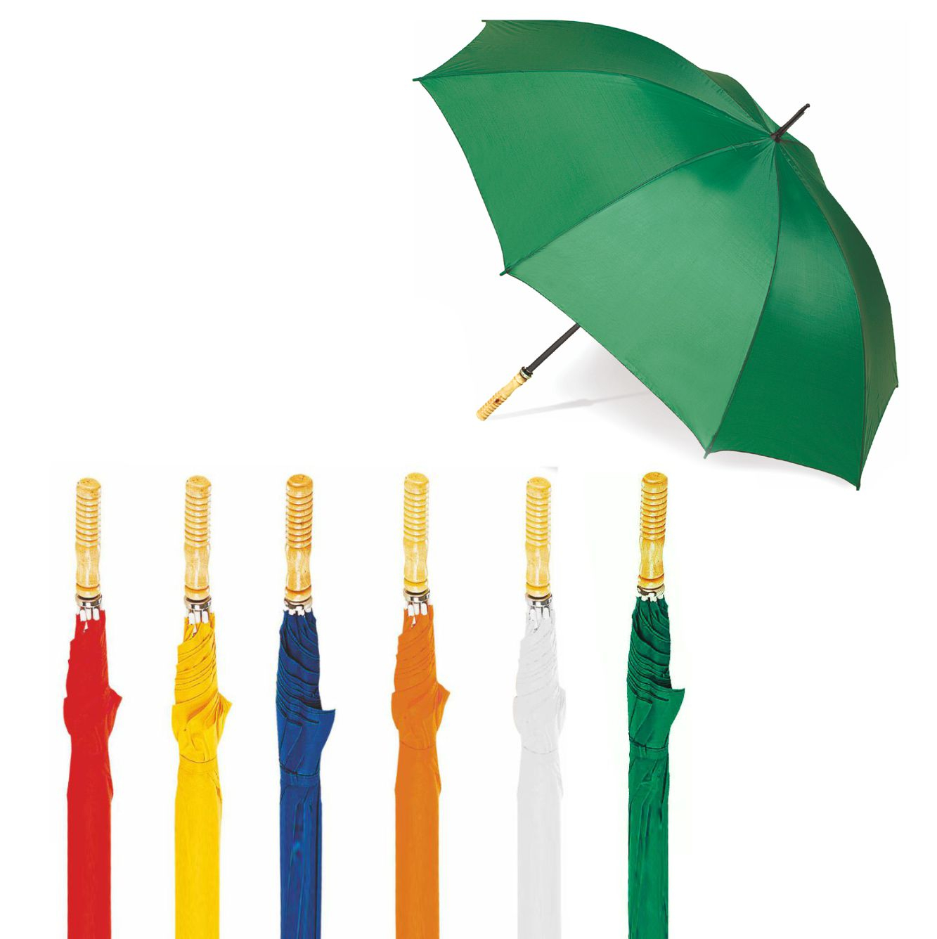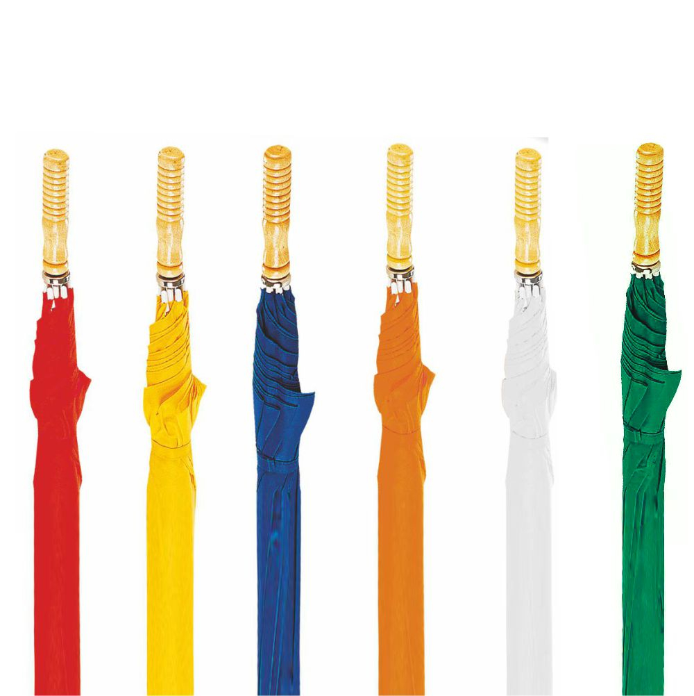 Ombrello Golf scatto manuale. Poliestere 190T. Manico dritto in legno. Fusto e puntale in metallo. Colori blu, giallo, rosso, arancio, verde, bianco. Dimensioni Ǿ cm 122 h cm. 102. Imballo: 36xcolore