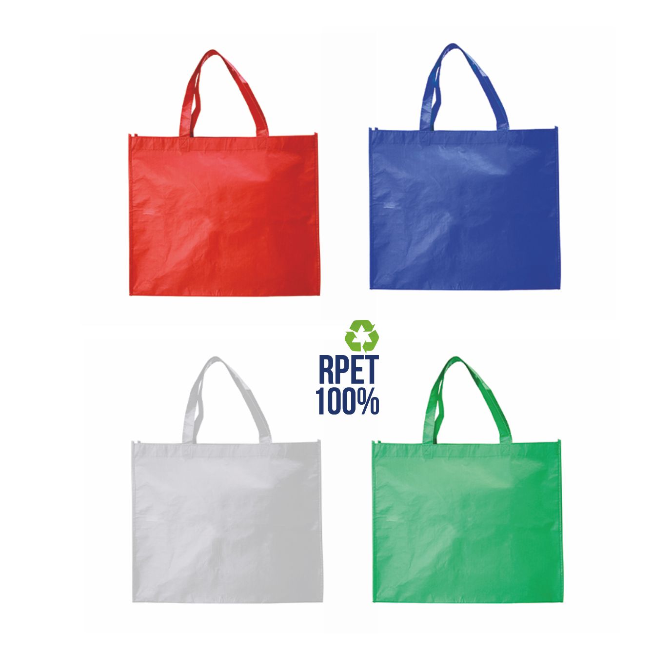 Borsa shopping in RPET, cucita con rifinitura in laminato opaco, manici rinforzati.. Dimensione: cm 41x37x14. Confezione: non confezionato