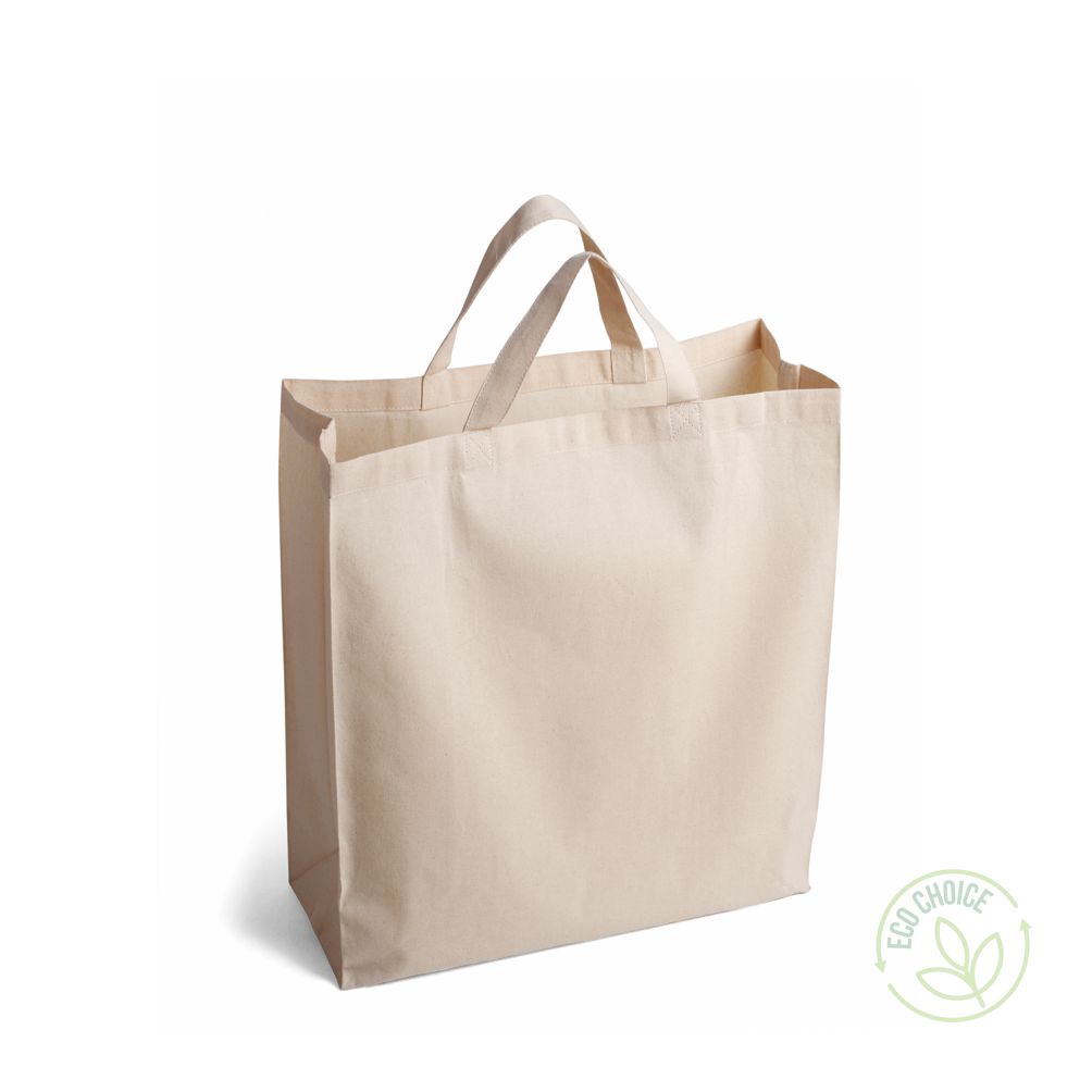 Borsa shopping in cotone riciclato 180 g/m² con manici lunghi cm 2,5×60. Dimensioni: cm 45x41x16. Imballo: 100pz.