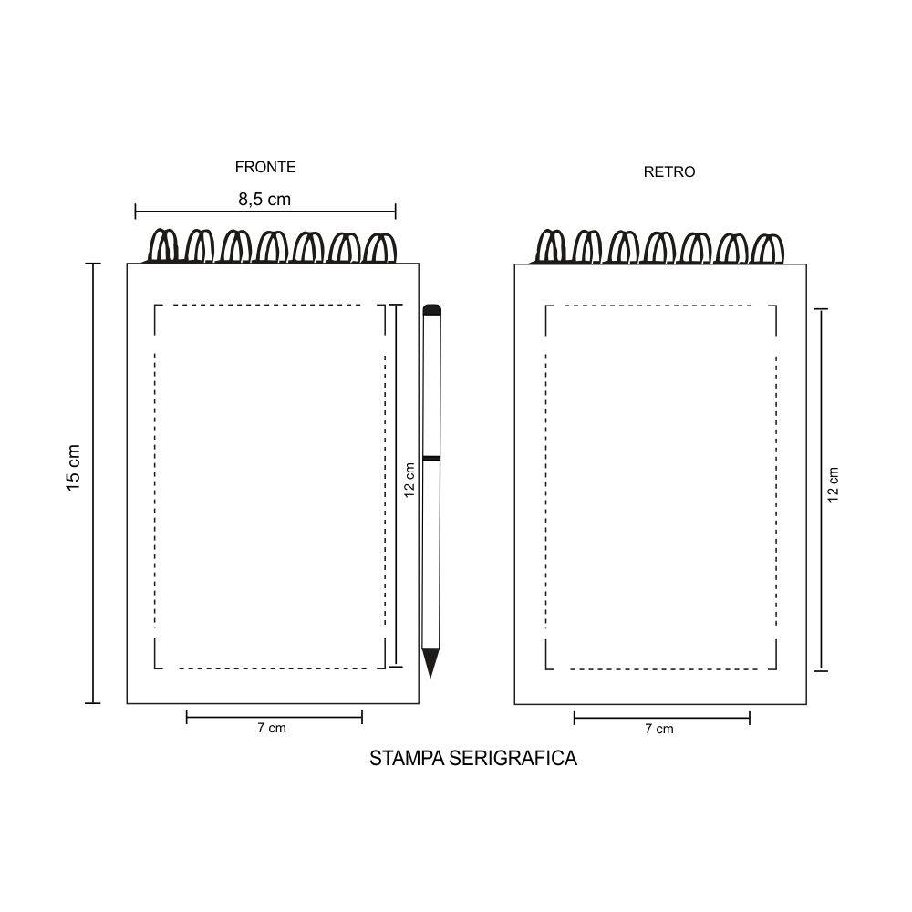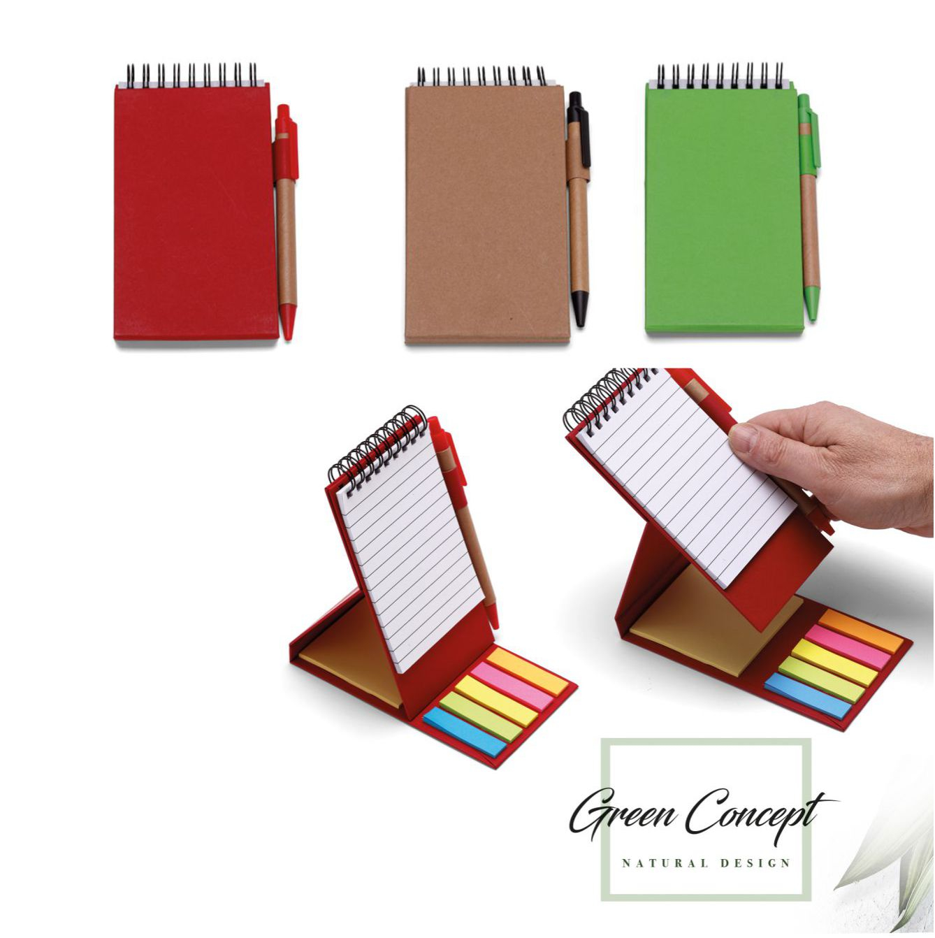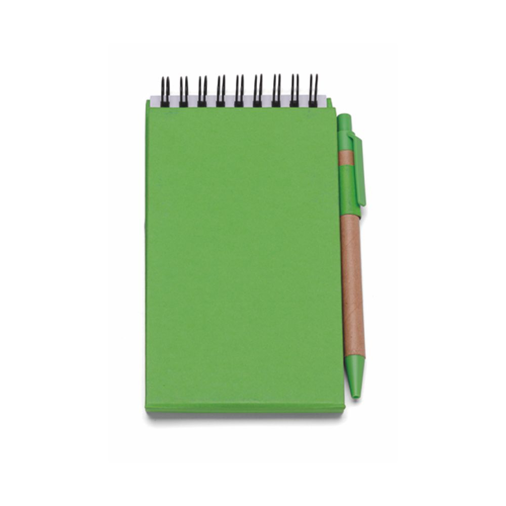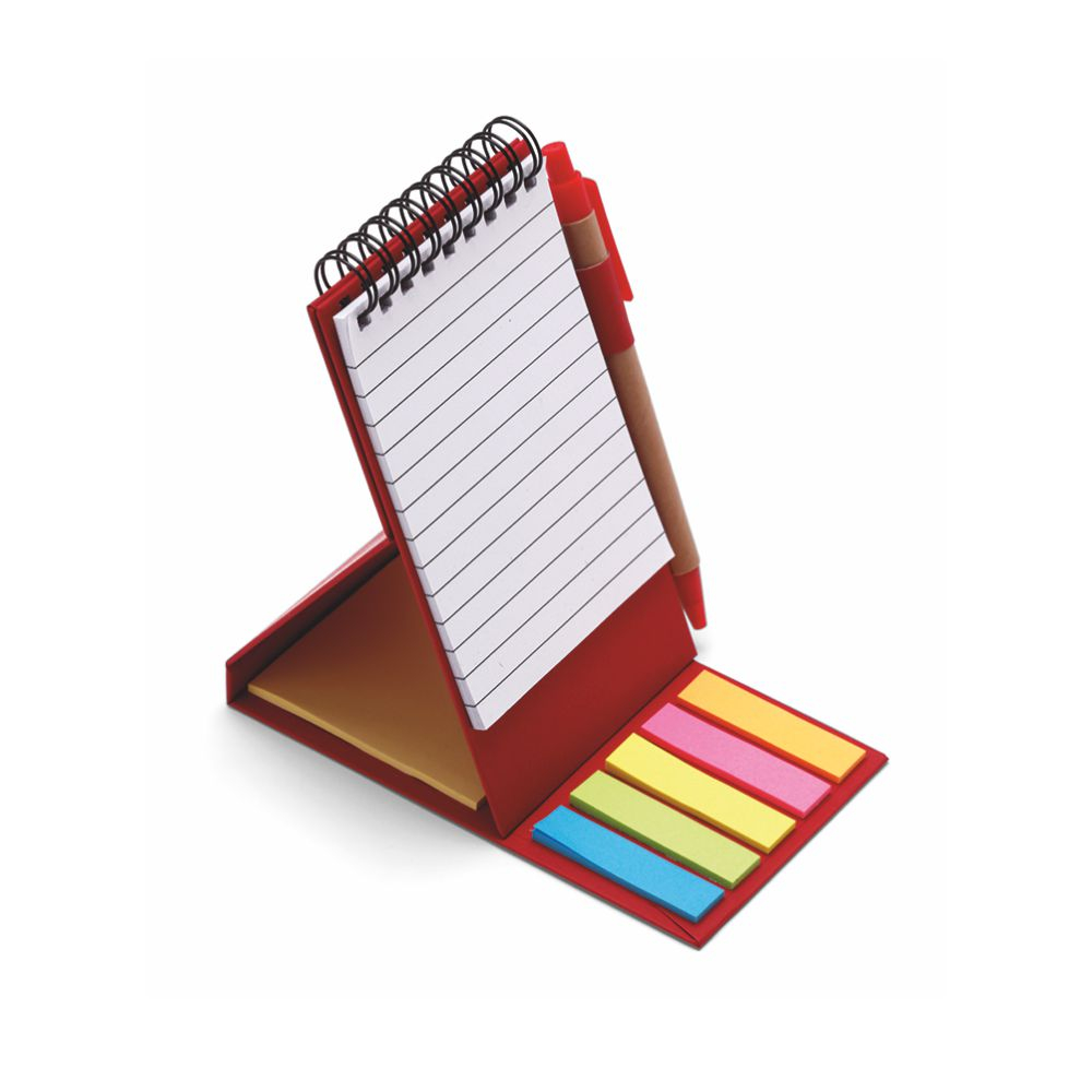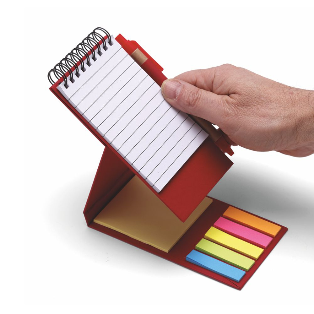 Blocco notes “Eco paper”. Carta 70gr. 70 fogli a righe. Corredato di: 25 post-it per colore, pen-na refill nero. Colori: rosso, avana, verde, blu. Confezione in polybag. . Dimensioni cm. 8,5×15 Imballo: 100xcolore