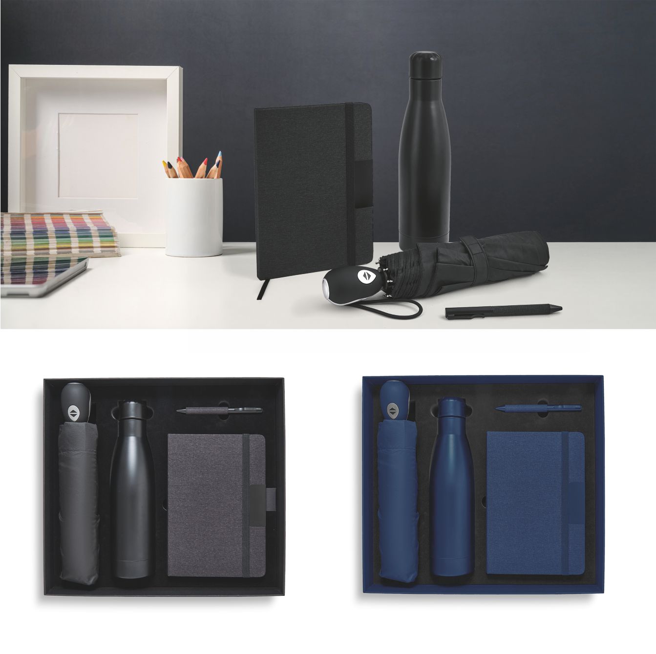 Set Regalo composto da: Block Notes in RPET da 80 fogli a righe da 100gr con copertina rigida elastico e dettaglio in alluminio in tinta, penna in RPET e alluminio, borraccia termica in acciaio da 500ml, ombrello pieghevole in RPET. Dimensioni: cm 35,5×7,5×31. Il complemento ideale per chi ama essere organizzato con stile.