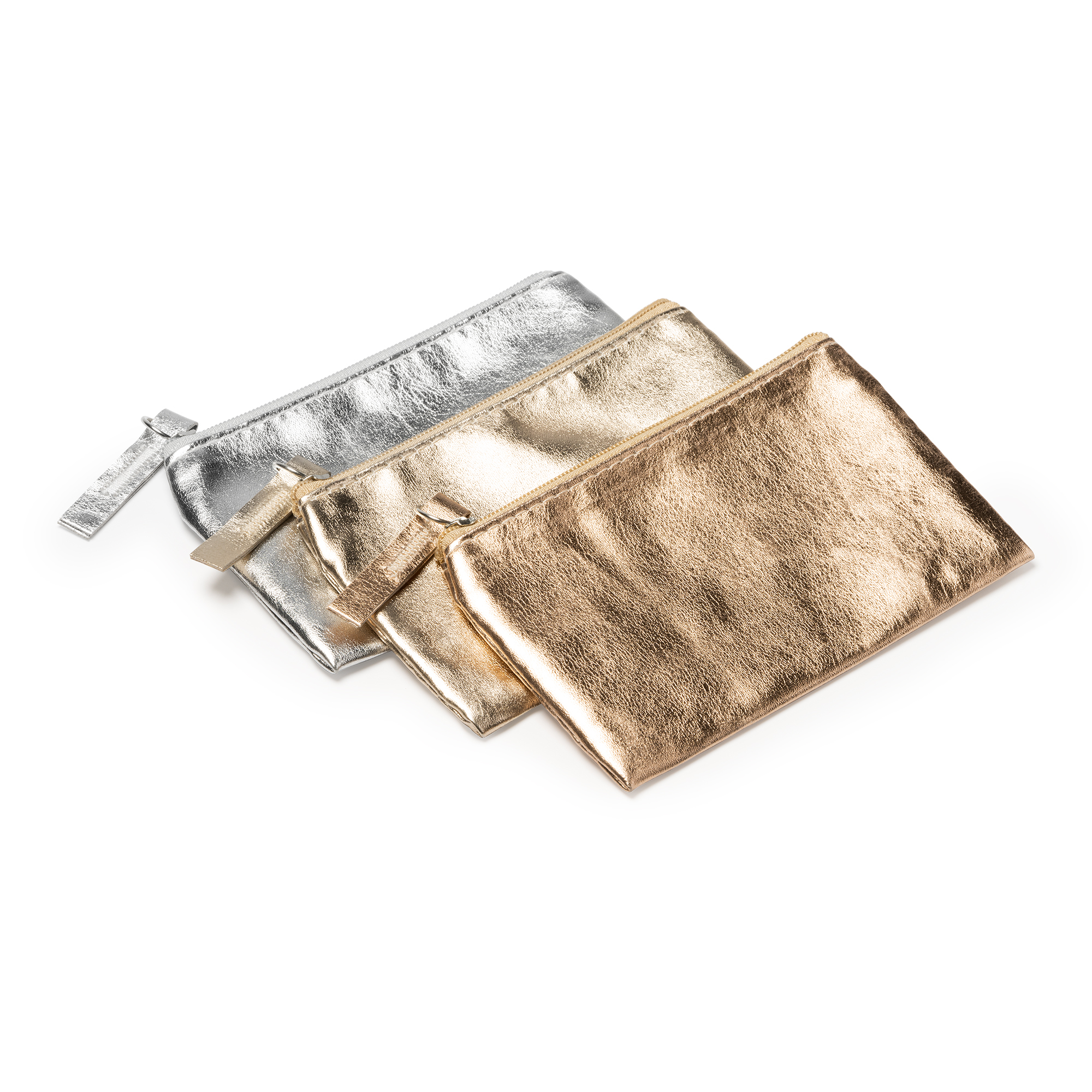 Borsetta in PU lucido, con cerniera e tiretto abbinati. Dimensioni: cm 12×8,5. Imballo: 1000pz
