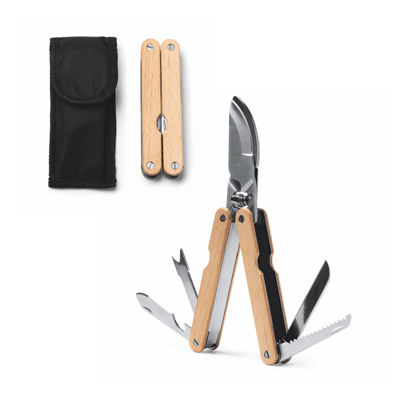 Utensili multiuso in acciaio inox e manico in bamboo. 6 funzioni: forbici, rasoio, sega, lima, cacciavite e apribottiglie. Dimensioni: cm 20x2x8,5. Realizzata per offrire qualità e prestazioni elevate.