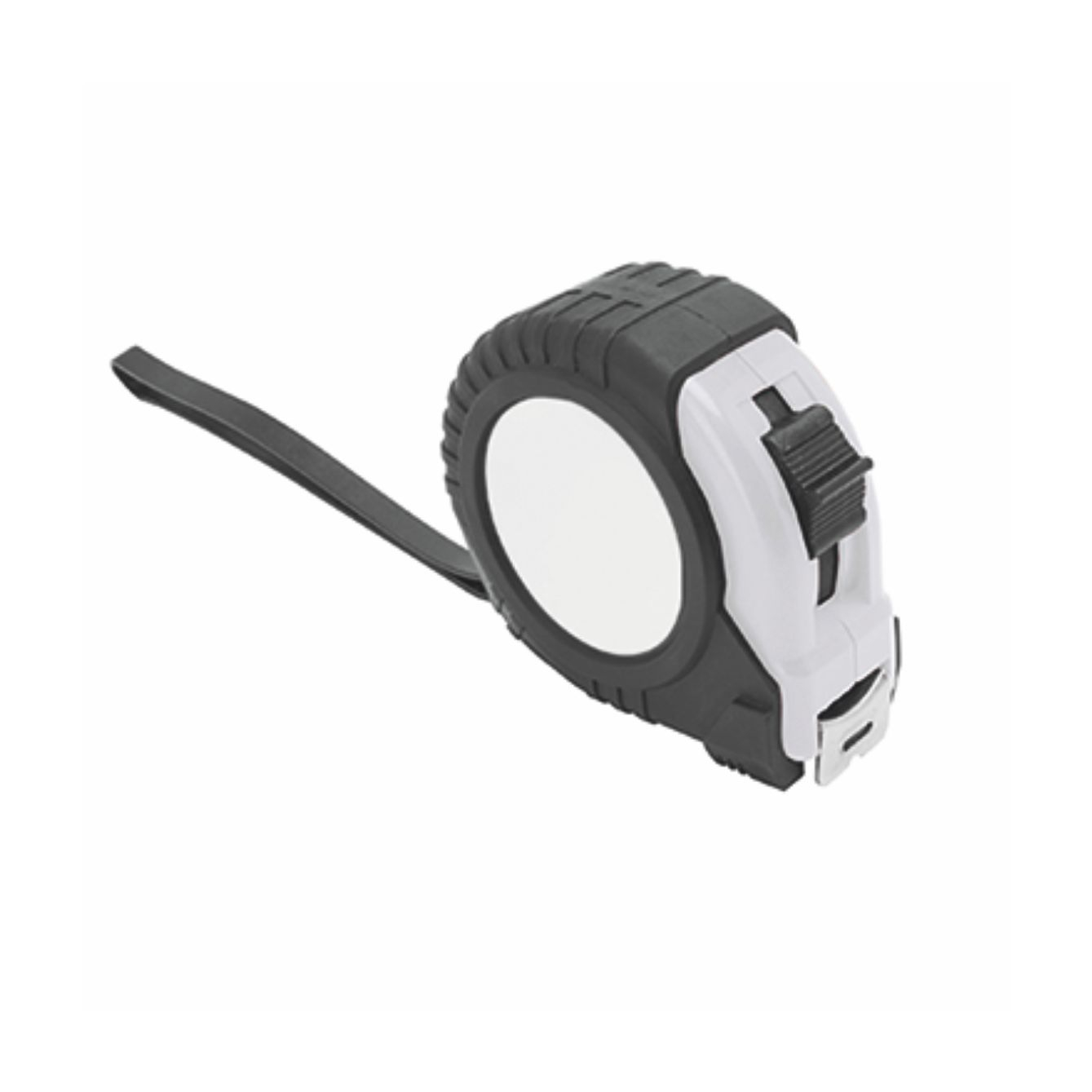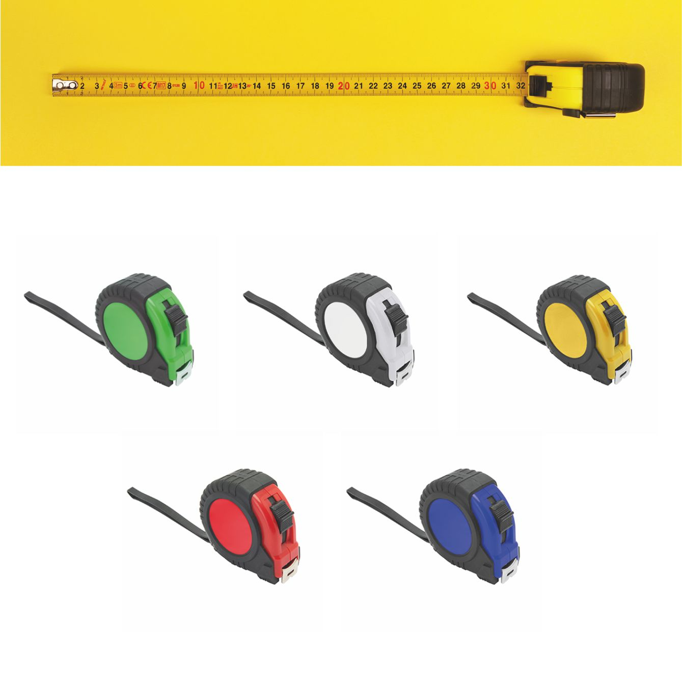Flessometro omologato da 3 metri con meccanismo di bloccaggio e nastro in metallo. Corpo colorato con copertura in gomma, clip in metallo e maniglia.. Dimensione: cm 6,5x3x6. Confezione: in astuccio