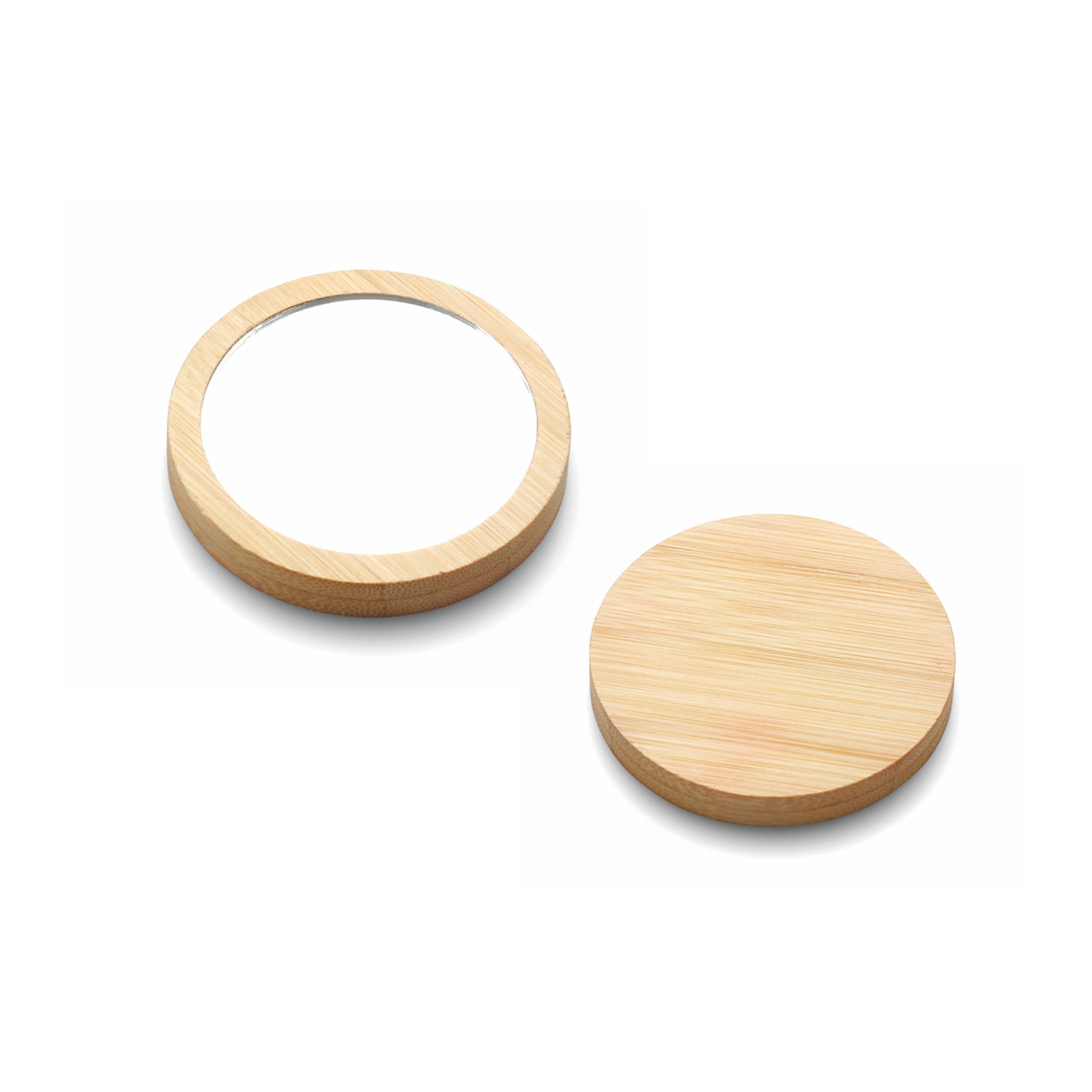 Specchietto in bamboo. Dimensioni: cm ø 7. Confezione in polybag. Imballo: 500pz.
