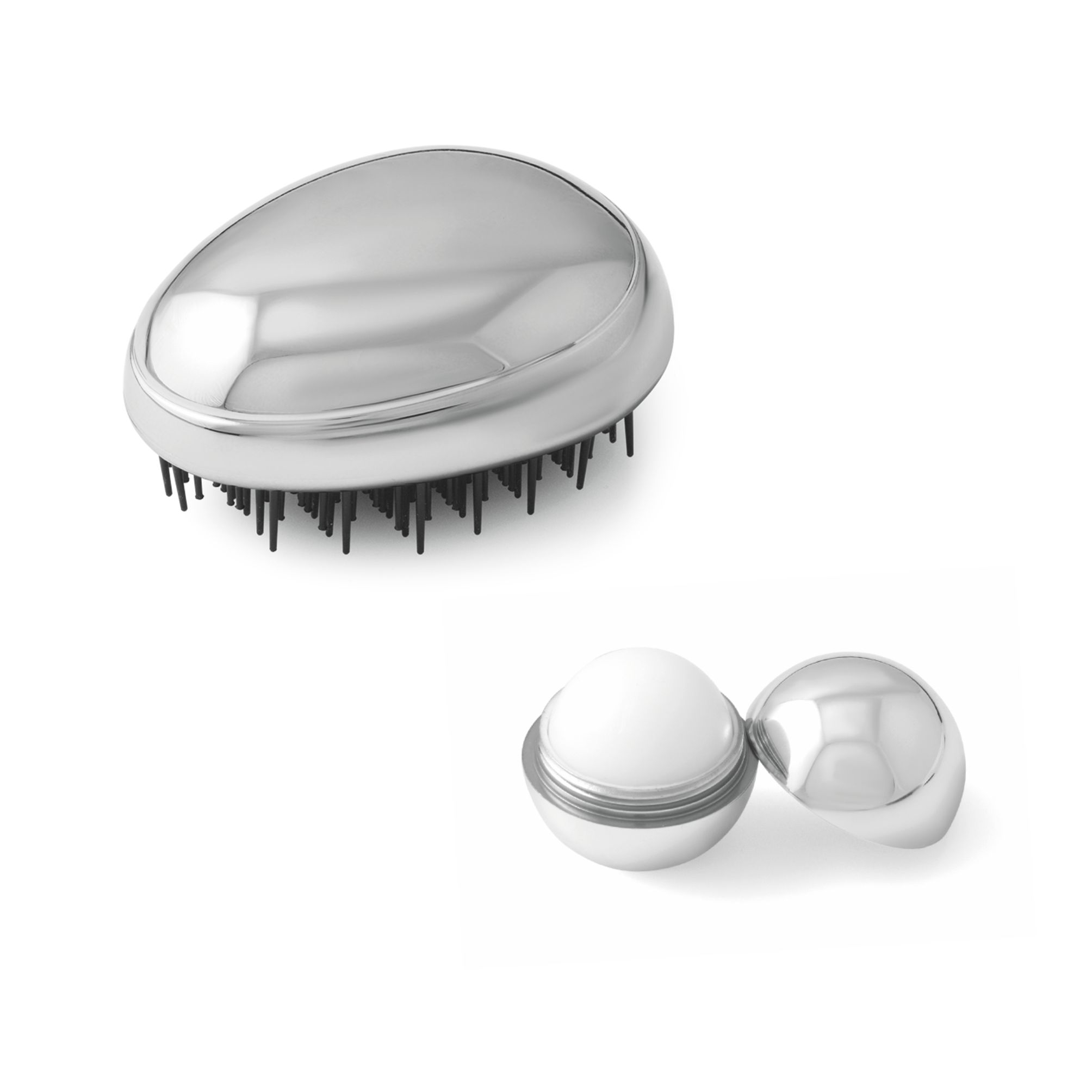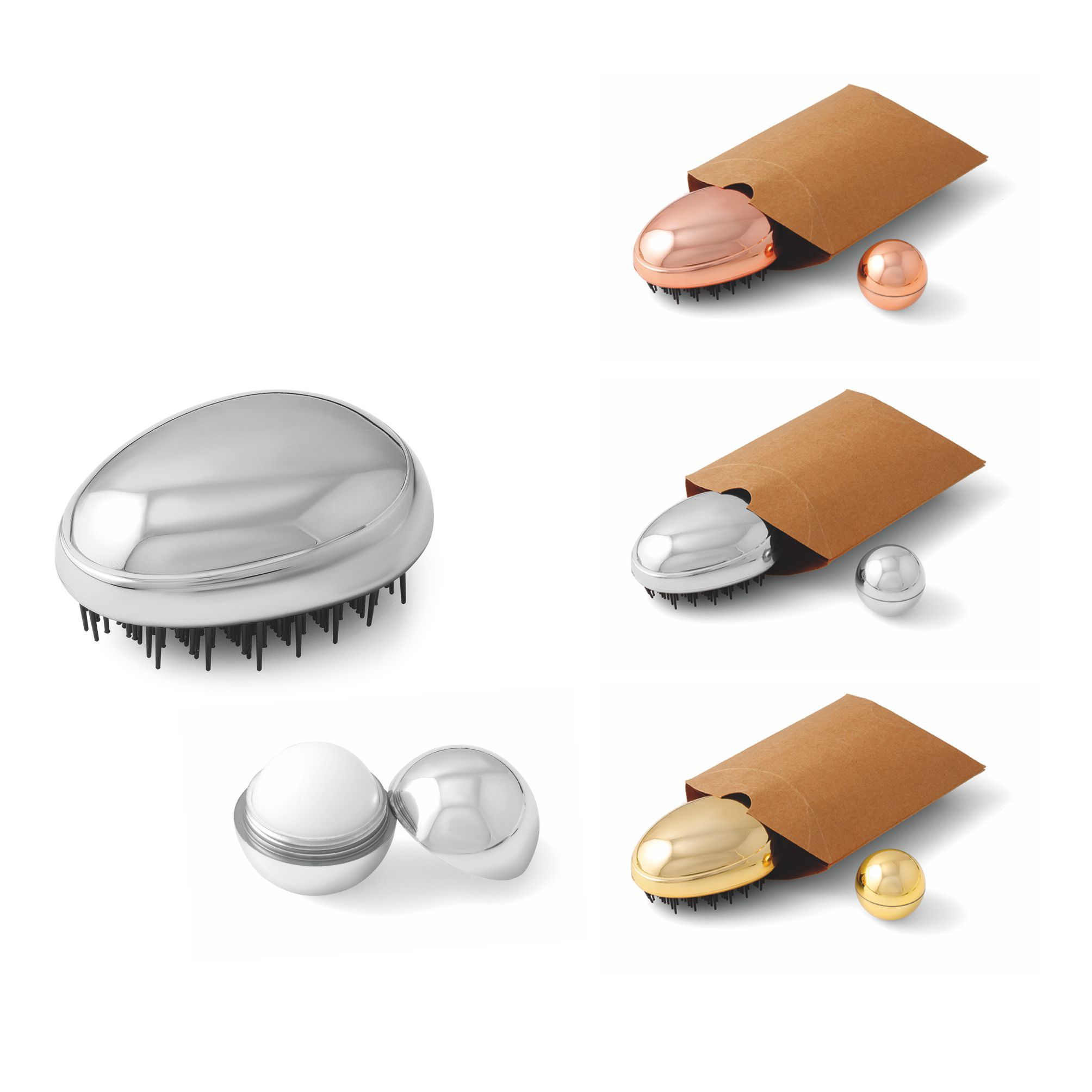 Set spazzola più burrocacao in plastica. Confezione in astuccio eco. Dimensioni: spazzola cm 6,7×4,5×9 / burrocacao cm 3,8 astuccio cm 12×14,5. Imballo: 50pz.