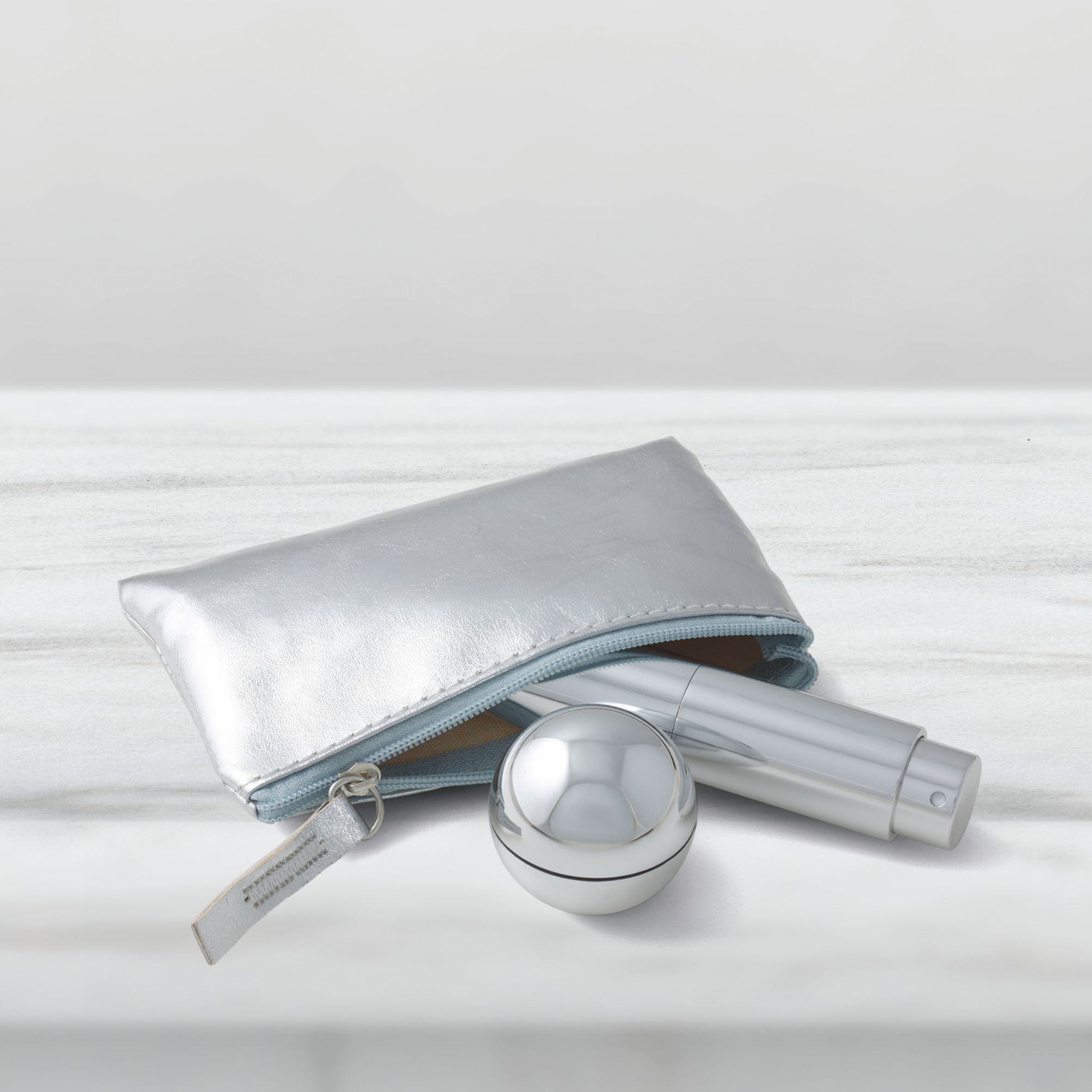 Set pochette, spruzzino e burrocacao in Pu e plastica. Dimensioni: spruzzino cm 2,2×9,5 / burrocacao cm 3,8 pochette cm 12×8,5. Imballo: 50pz