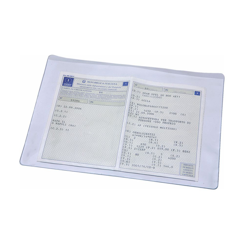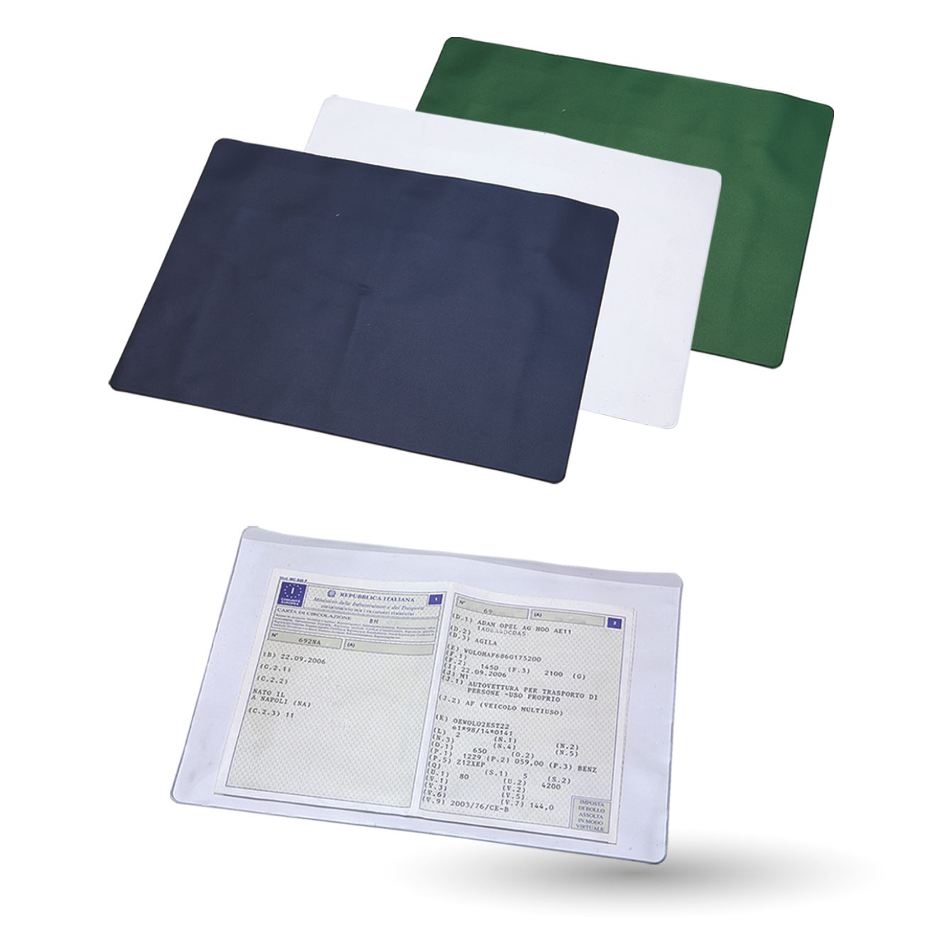 Porta documenti in pvc. Colori: bianco, blu, verde. Dimensioni cm 26×18,5 (aperto) Imballo: 500xcolore