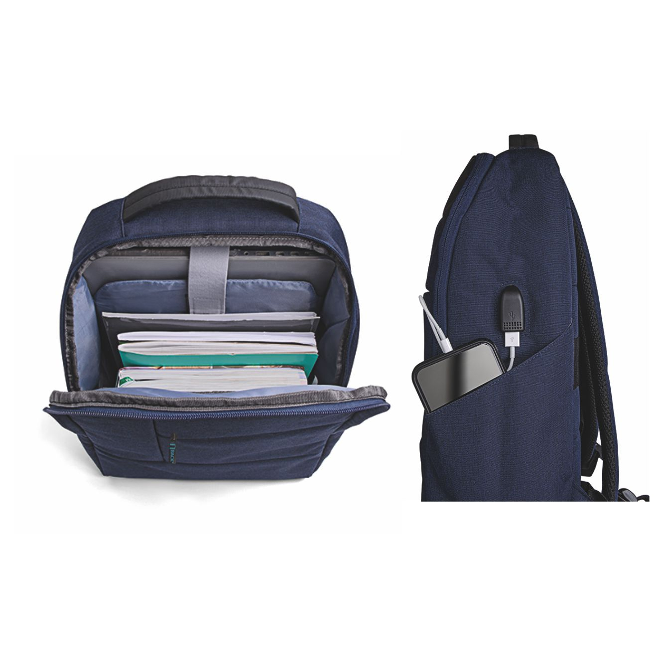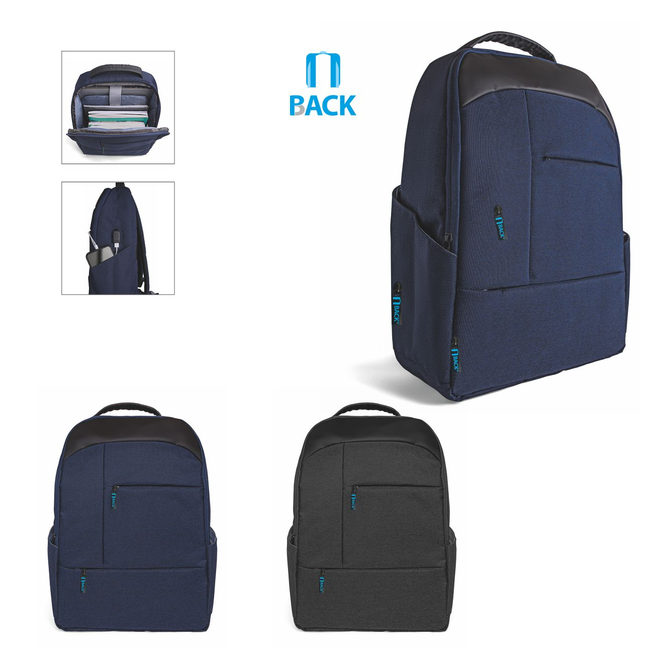 Zaino Portacomputer 17” in Poliestere 600D Oxford. Schienale e spallacci imbottiti, due ampi scomparti, 2 tasche laterali, 2 tasche frontali con zip, connettore USB con cavo incluso. Dimensione: cm 47x36x16. Confezione: polybag