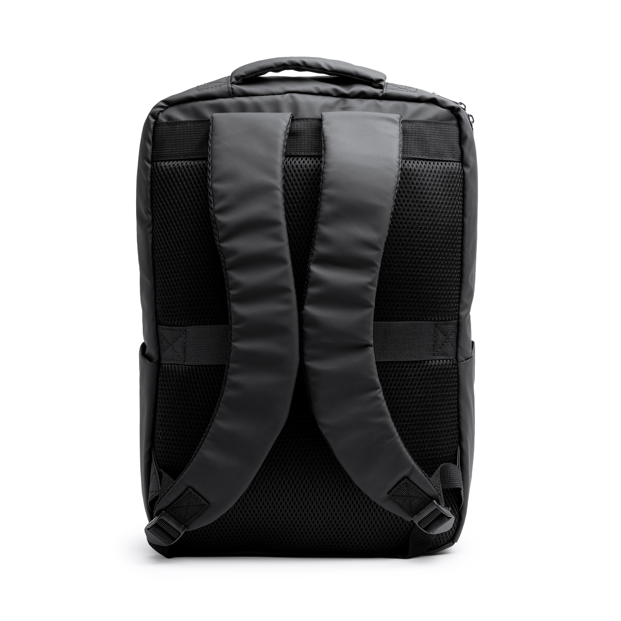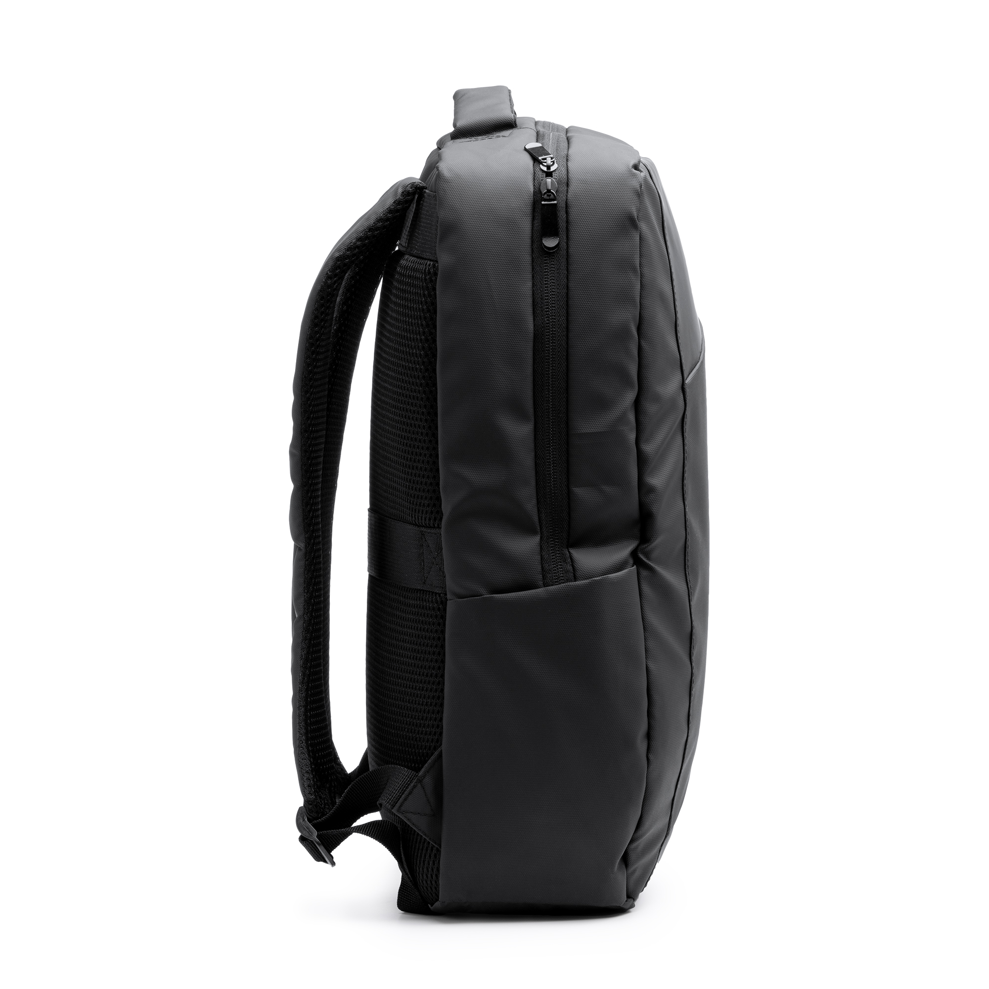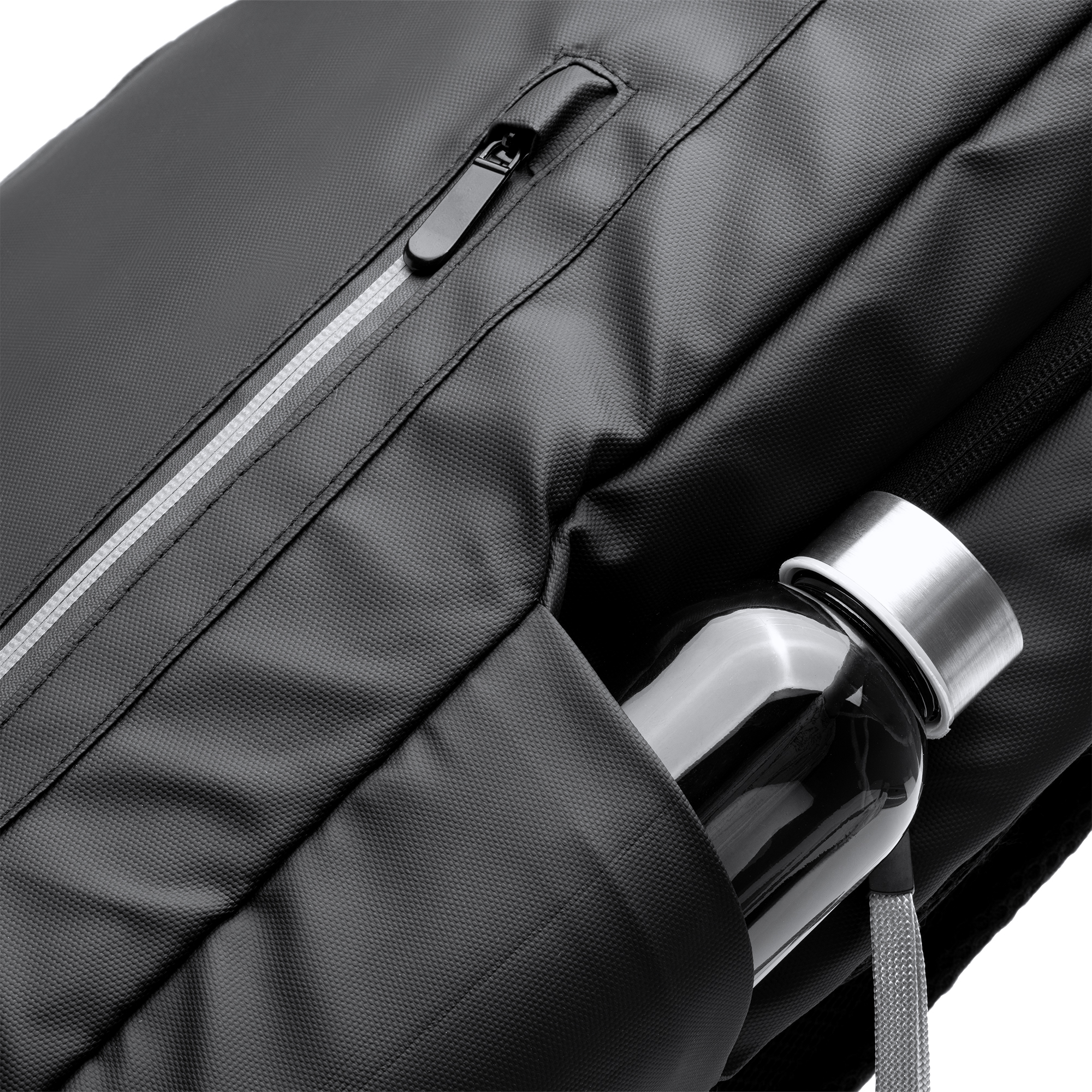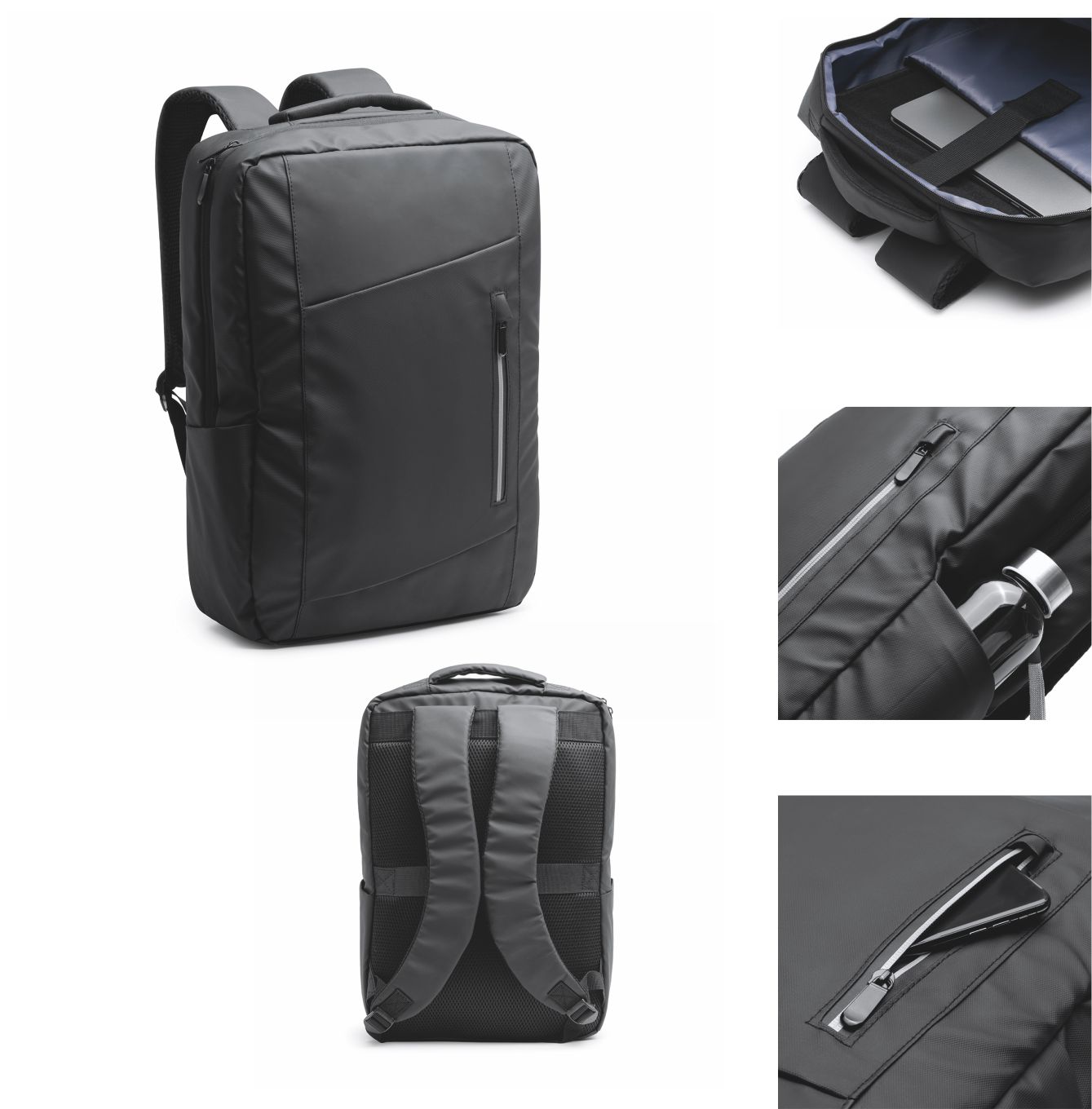 Zaino executive in pelle PU. Corpo imbottito e tasca interna, ideale per computer portatile o tablet da 13”. Tasca esterna con cerniera impermeabile e striscia per la visibilità. Doppio scomparto e tasche laterali. Spallacci e schienale imbottiti. Cinghia