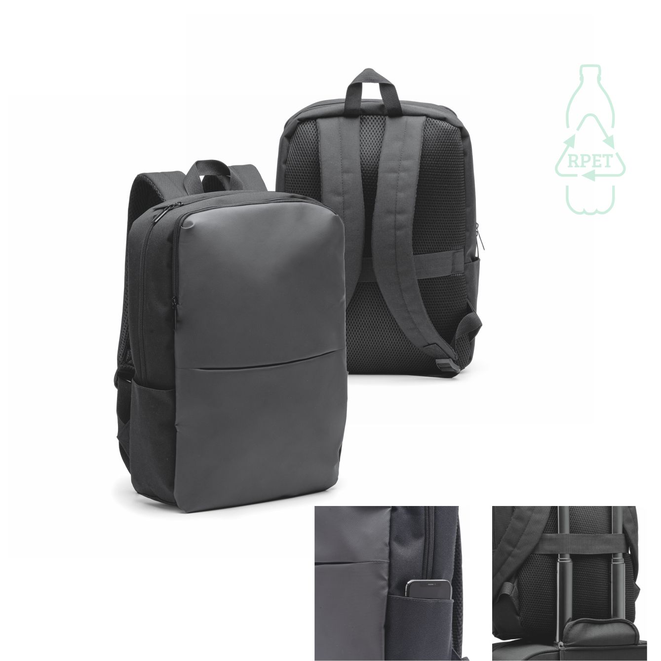 Zaino in pelle PU e poliestere 600D RPET. Scomparto principale con tasca interna imbottita per computer portatile da 15. Tasca frontale. Schienale e spallacci imbottiti. Dimensioni: cm 30x43x11