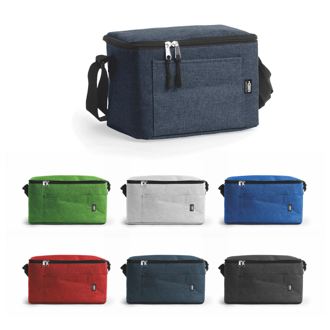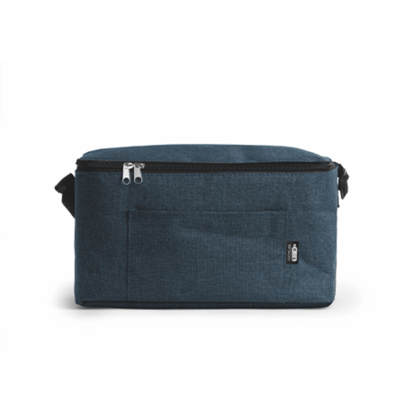 Borsa termica in poliestere riciclato RPET con disegno vigoré. Tasca frontale. Interno isometrico. Dimensioni: cm 25×15,5×15,5. Imballo: 60pz.