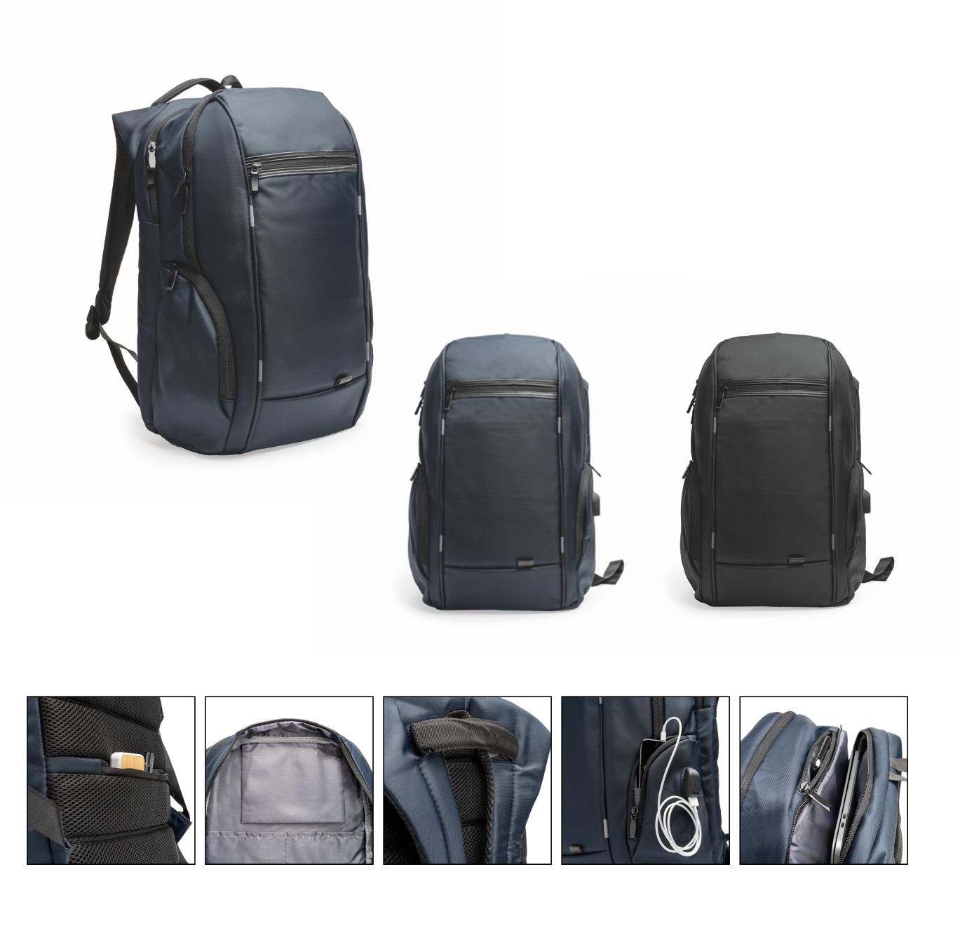 Zaino con tasca interna imbottita ideale per il computer portatile. Cinghie e schiena imbottiti. Scomparto con uscita USB per collegare un power bank (non incluso). Include cavo micro USB. In Nylon. Dimensioni: cm 30 x 45 x 20. Imballo: 10pz.