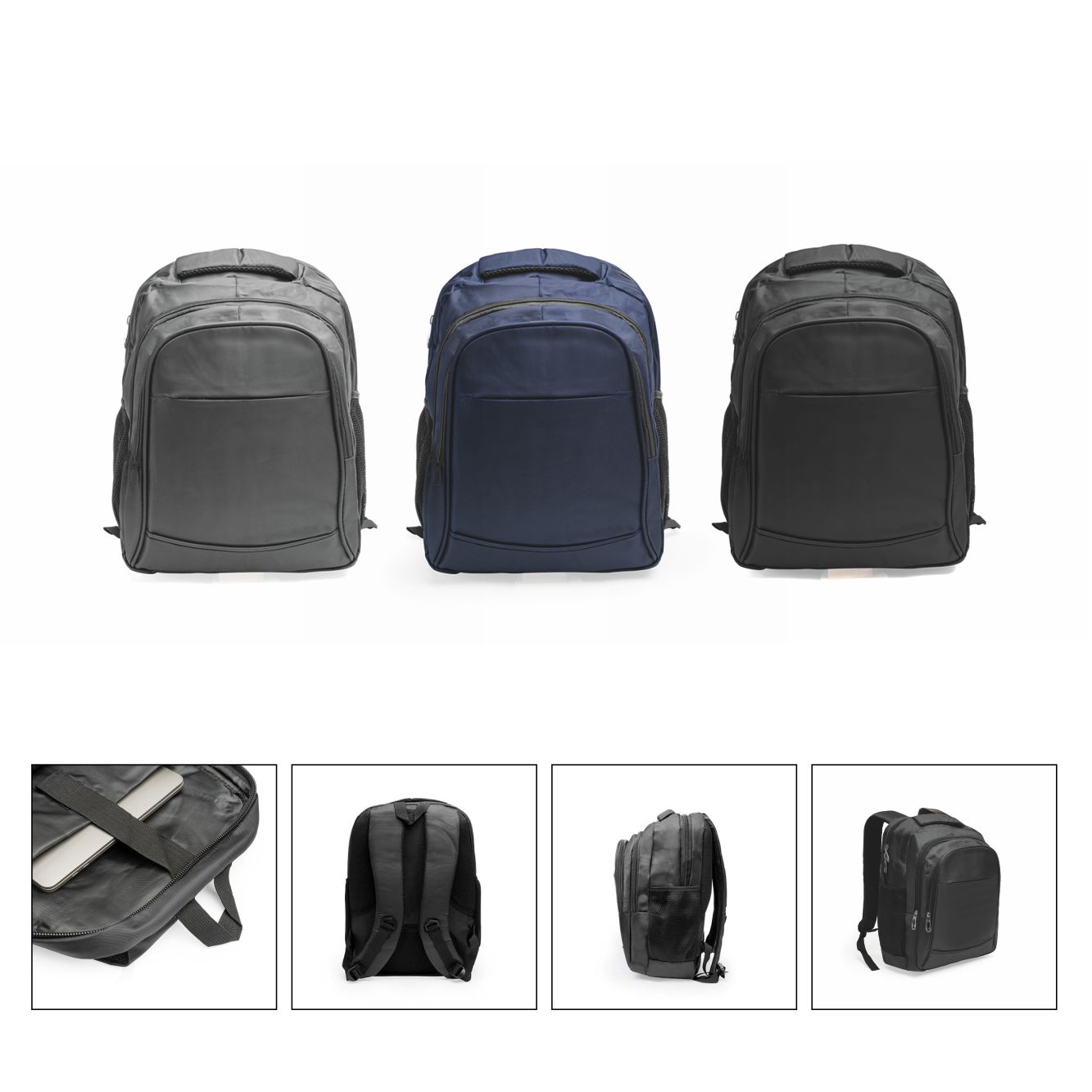 Zaino con spallacci e schiena imbottiti. Scomparto interno imbottito ideale per il computer portatile. In nylon. Dimensioni:cm 32,5 x 44 x 25. Imballo: 20pz.