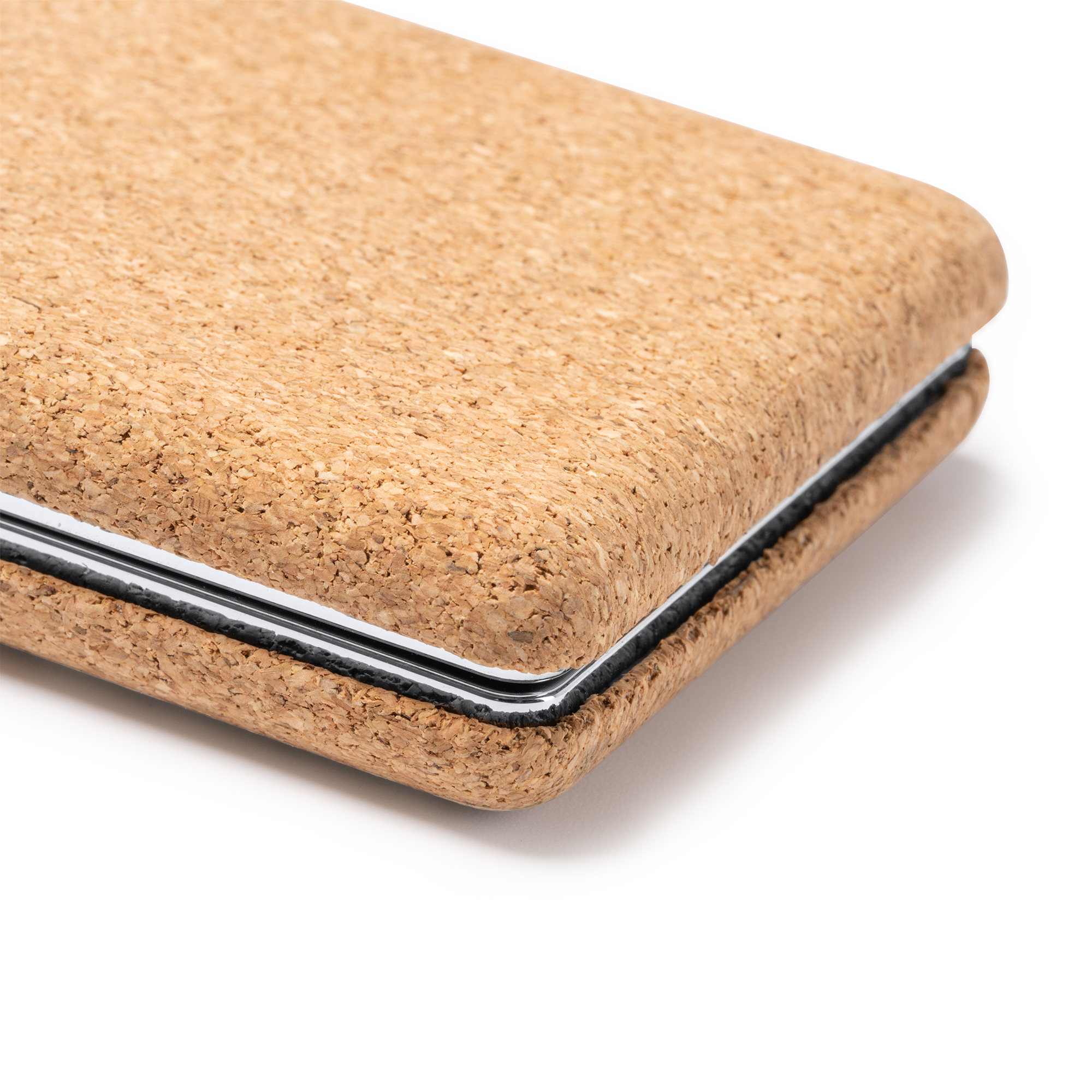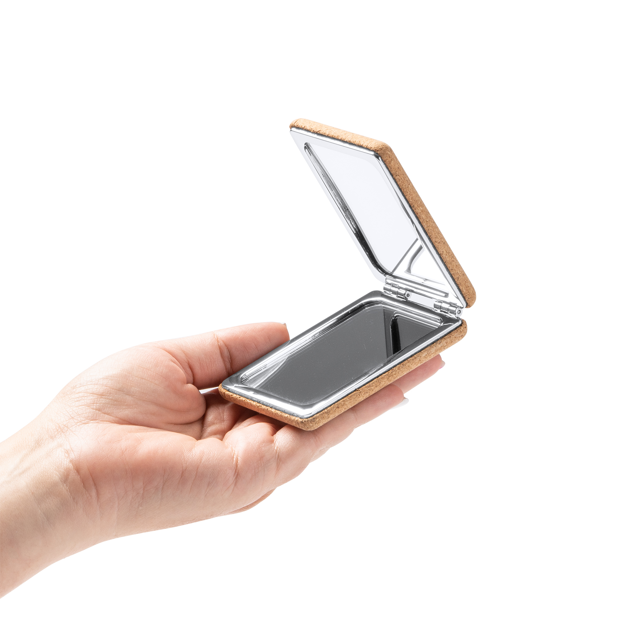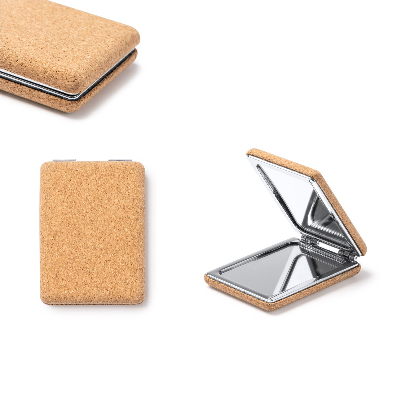 Specchio pieghevole tascabile in sughero naturale con finiture in metallo cromato. Dimensioni: cm 6,3x8x2