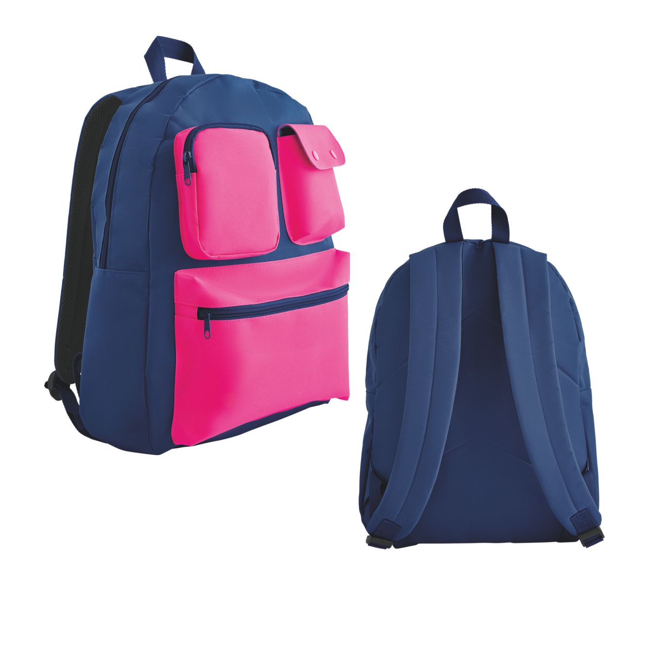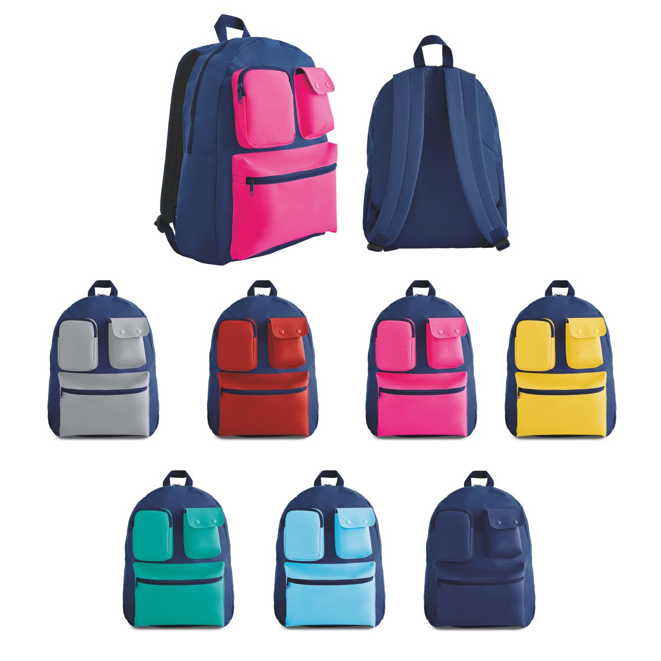 Zaino in poliestere 600D, 2 tasche frontali con chiusura zip e tasca con chiusura a doppio bottone. Tasca interna, manici e schienale imbottiti. Dimensioni: cm 34x44x14,5. Il complemento ideale per chi ama essere organizzato con stile.