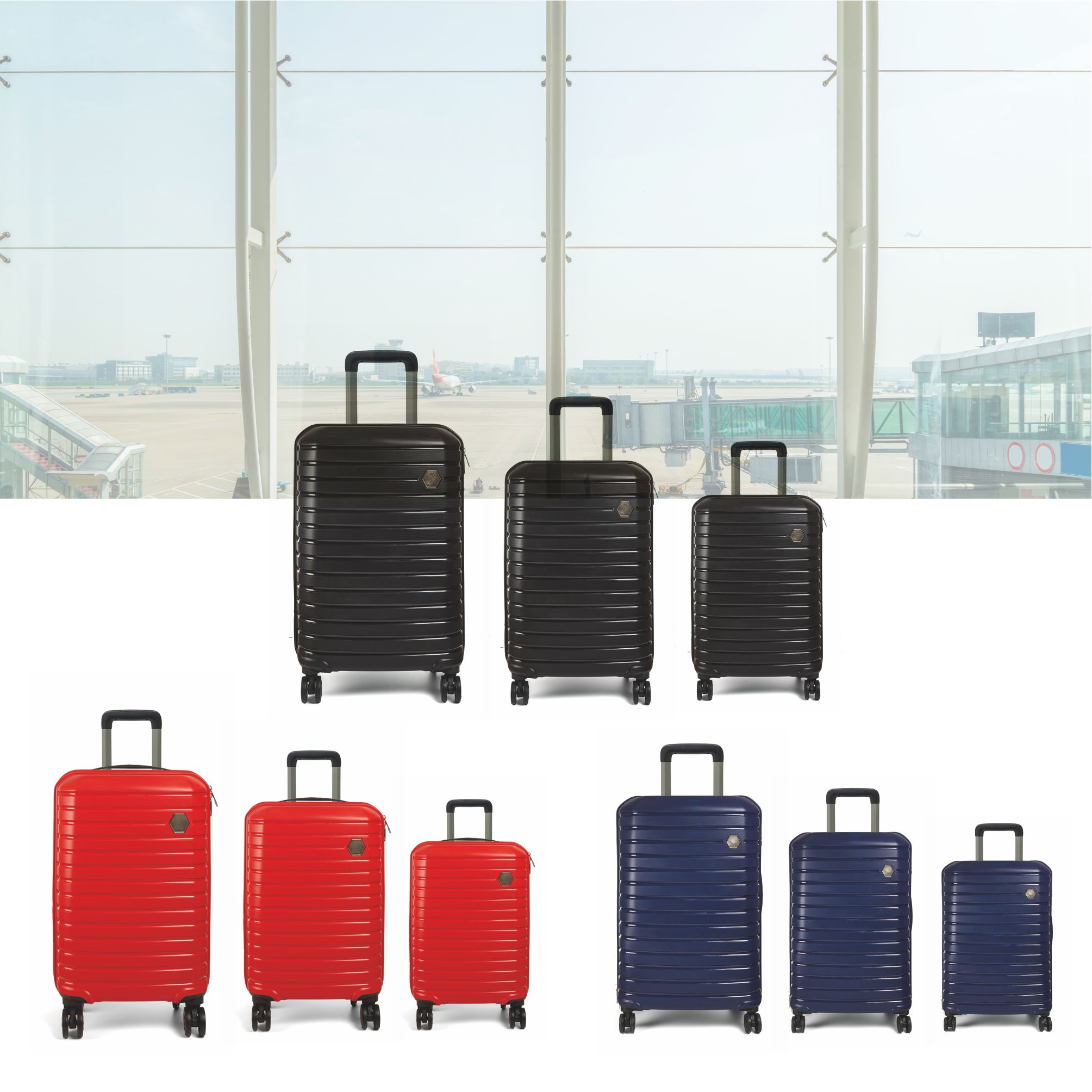 Set 3 valige da viaggio in polipropilene con 4 ruote, targhetta in metallo personalizzabile, chiusura americana, TSA lock, fodera nera interna. Dimensioni: L: cm 50x78x32 M: cm 43,5x67x31 S: cm 41x57x23.