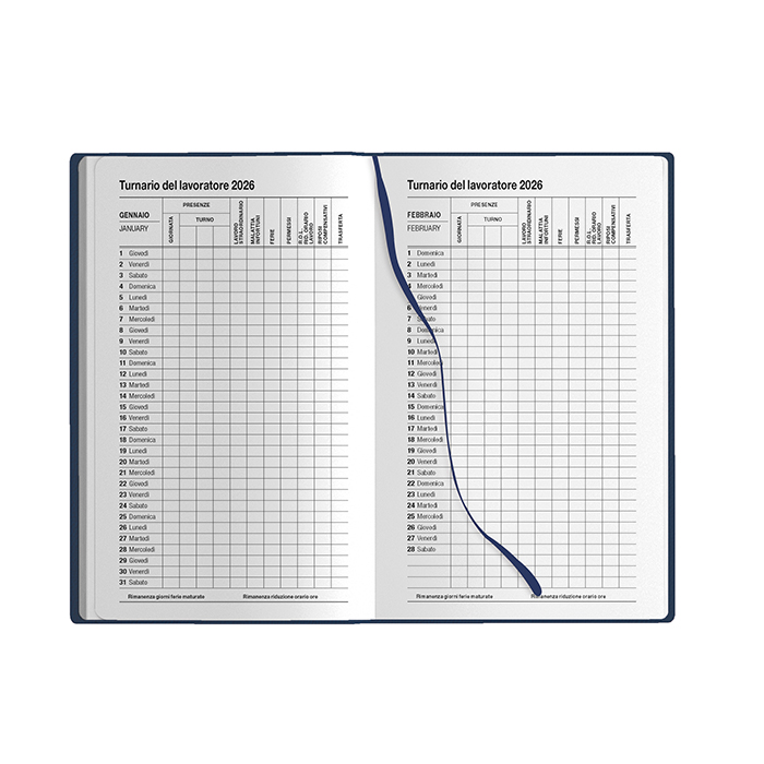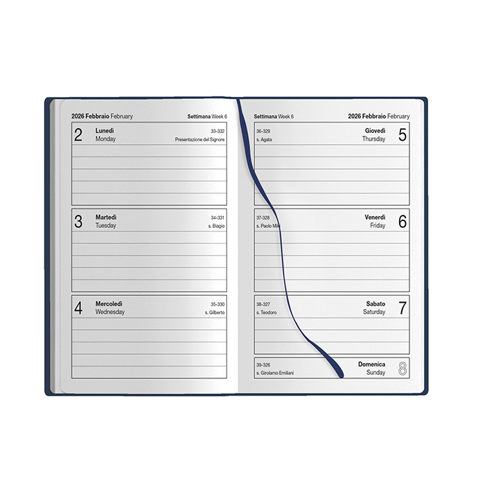 agenda settimanale 128 pagine_x000d_ copertina in PU_x000d_ edizione multilingue: IT – GB – FR – DE – ES – PT_x000d_ segnapagine ed elastico in tinta_x000d_ inserto cartografico