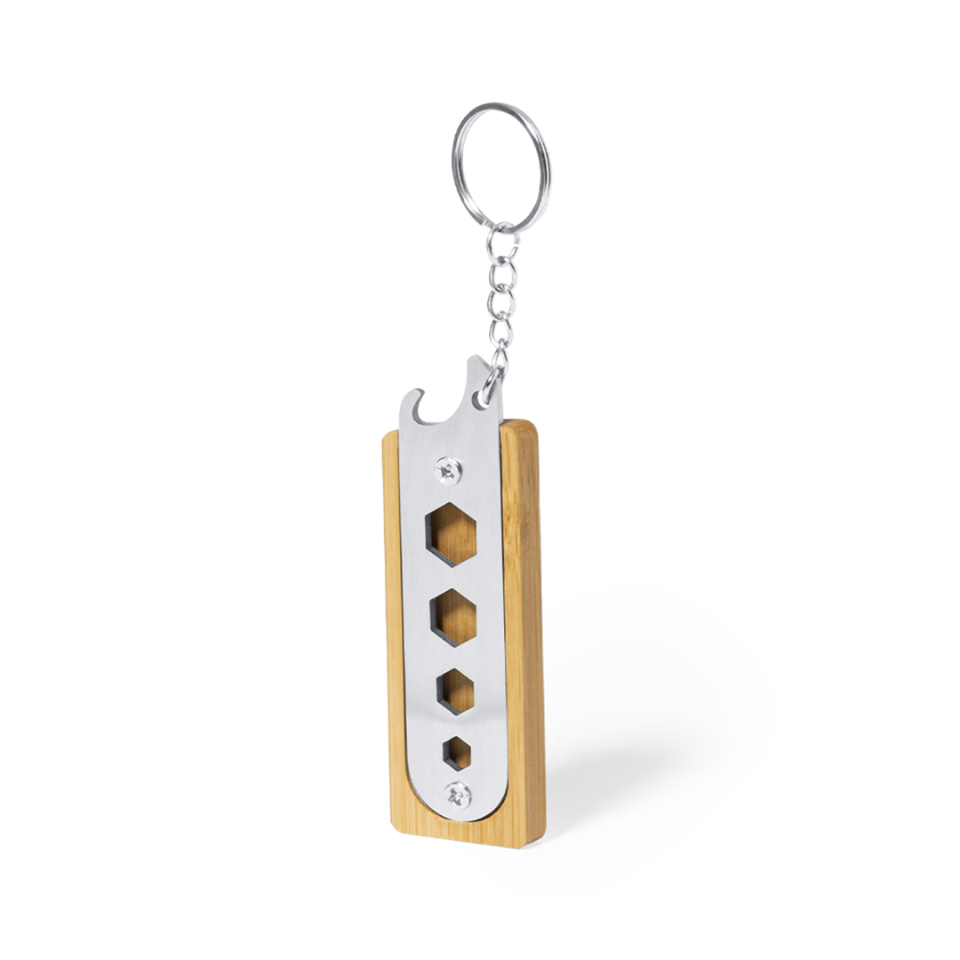 Portachiavi multiutensile in robusto acciaio inossidabile e bambù. Con pratico set di 4 chiavi esagonali fustellate e apribottiglie. Presentato in una scatola kraft dal design individuale.