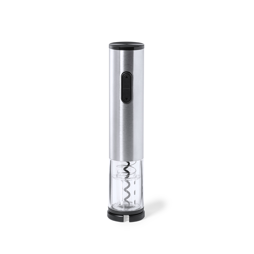 Cavatappi elettrico in acciaio inossidabile e ABS resistente, con tagliacapsule incluso. Confezionato singolarmente in una scatola di design, con manuale di istruzioni in inglese e spagnolo. Alimentazione a batteria (4xAA non incluse).