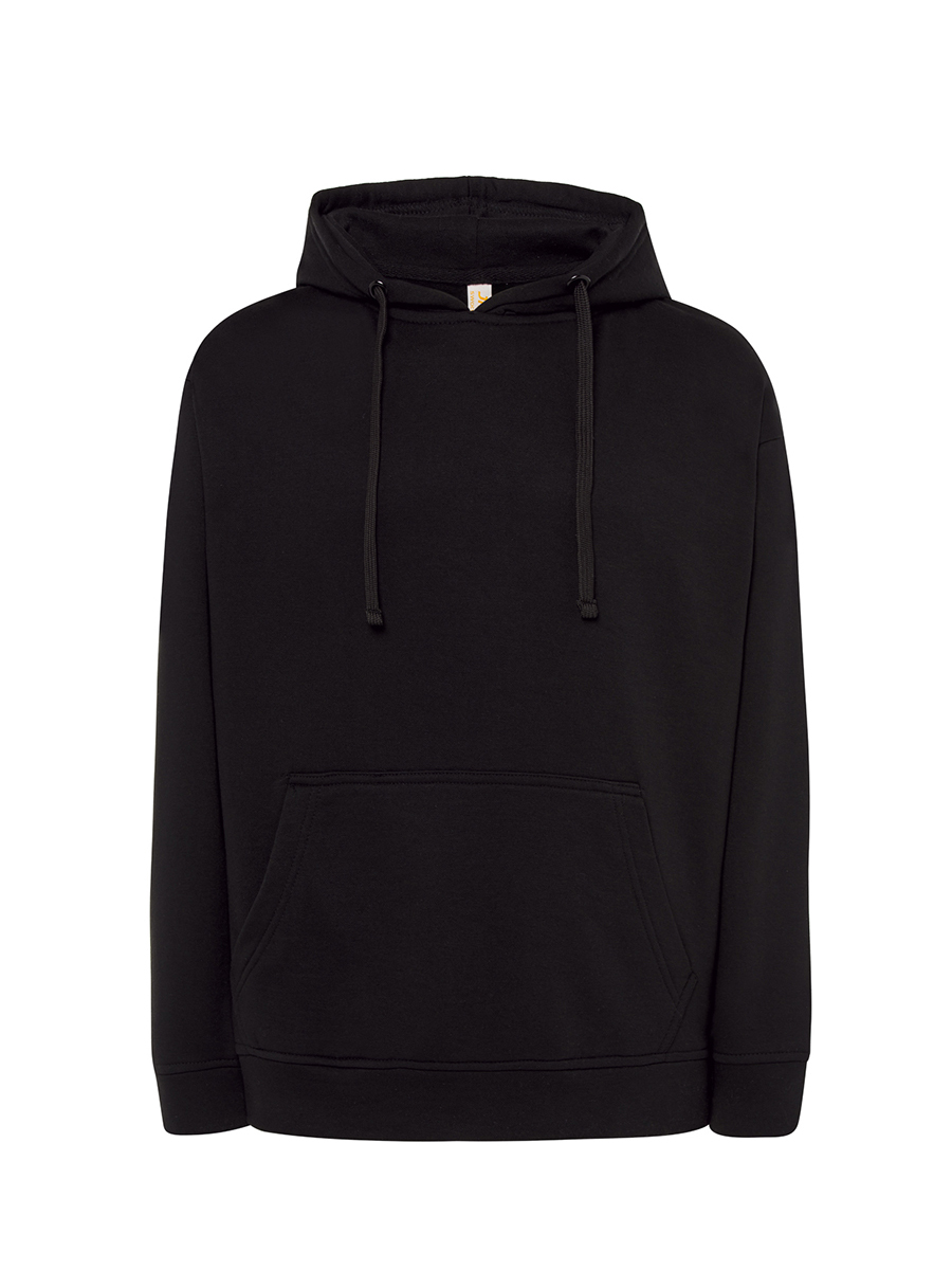 Felpa da uomo con cappuccio in tessuto leggero French Terry; Doppia cucitura su collo, polsini e fondo; Costine 1×1 polsini e fondo in lycra; Cordino piatto dello stesso colore del tessuto; Tasche a marsupio