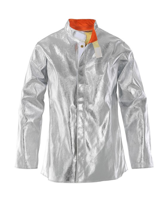 Giacca in tessuto di fibra aramidica alluminizzata 450 g/m², chiusura centrale con velcro e bottoni automatici rivestiti esternamente in tessuto aramidico alluminizzato, collo alla coreana. Cuciture tutte in filato di kevlar 50/3. Protezione per avvicinamento a fonti di calore, da brevi contatti con le fiamme e per i seguenti tipi di calore: convettivo, radiante, spruzzi di alluminio, spruzzi di ferro fuso, attività di saldatura e processi collegati con rischi equivalenti. APPLICAZIONI: Fonderie, fornaci, lavori di saldatura o taglio. TAGLIA: XL.