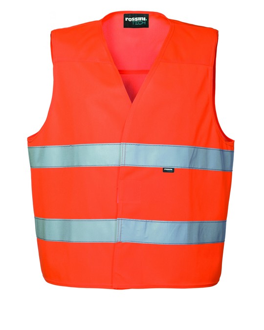 Gilet alta visibilità con chiusura centrale con velcro, collo a V e doppia banda rifrangente al girovita. TAGLIA UNICA.