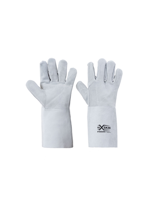 Guanto completamente in crosta, palmo rinforzato, manichetta di sicurezza da 15 cm, resistente al taglio, all’abrasione e allo strappo. Taglia 10