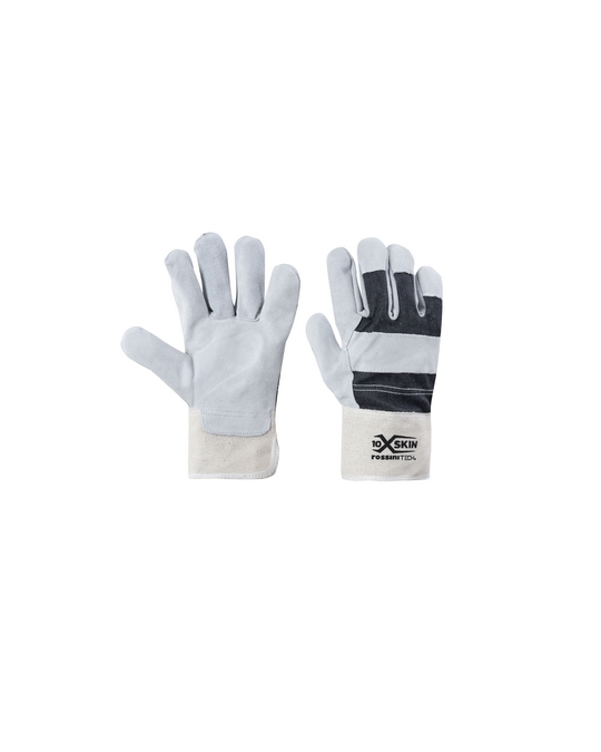 Guanto con palmo in crosta, felpato internamente, dorso jeans con elastico interno, manichetta di sicurezza tela rigida da 7 cm, resistente al taglio, all’abrasione e allo strappo. Taglia 10.