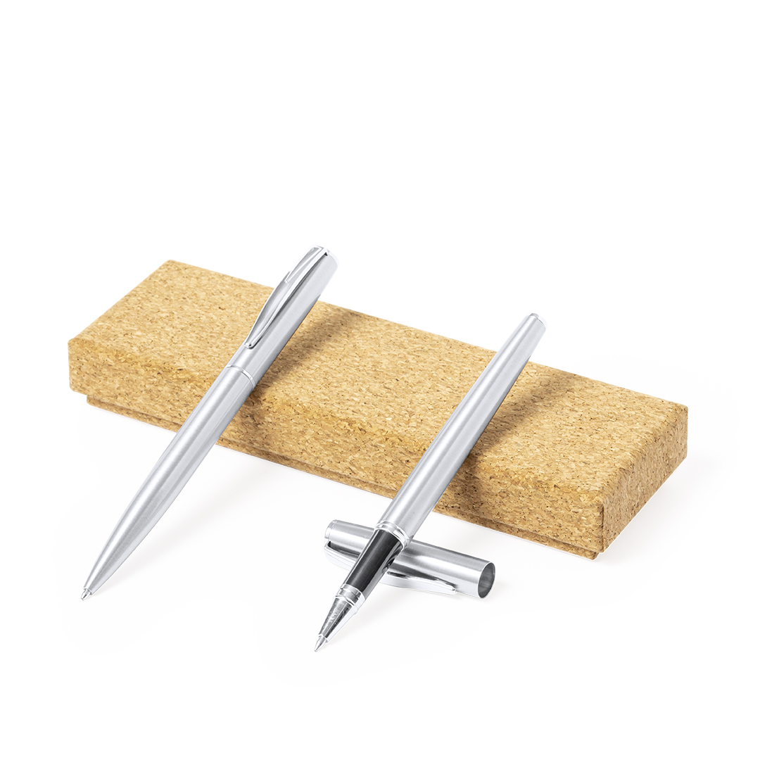 Set di penna biro e roller in Acciaio Inox Riciclato. Penna con meccanismo a rotazione e roller con cappuccio, entrambi con clip in metallo e inchiostro blu, con fusto a finitura lucida e logo Recycled Stainless Steel incluso. Presentato in un astuccio di sughero.L’acciaio è uno dei materiali più ricercati e si trova praticamente ovunque, dai prodotti di uso quotidiano alle grandi costruzioni. Le sue innumerevoli proprietà, tra cui la durata e l’alto grado di riutilizzabilità, lo rendono un’alternativa molto apprezzata nelle soluzioni di sostenibilità. Opportunamente trattato, consente di ottenere nuove risorse di uso infinito.