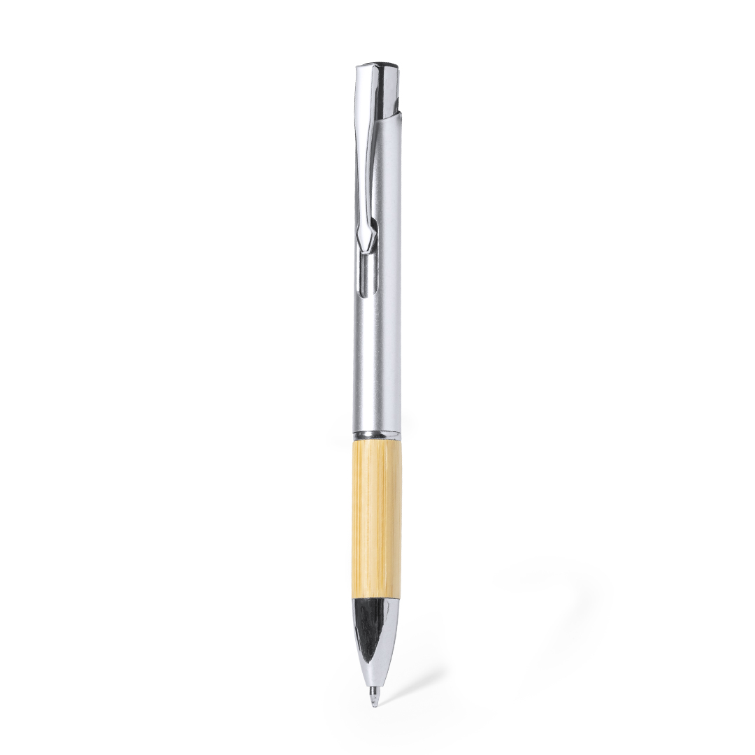 Elegante penna a sfera dalla linea natura con meccanismo a pulsante. Corpo in ABS con finitura lucida e impugnatura in bambù, con accessori coordinati. Clip in metallo, con cartuccia jumbo e inchiostro blu.